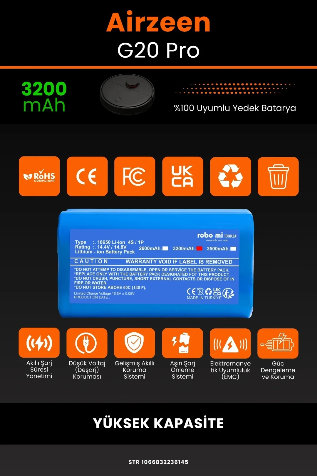 Airzeen G20 Pro robot süpürgeniz için özel olarak geliştirilen robo mi 3200mAh Li-ion batarya modülü, cihazınıza ilk günkü performansı geri kazandırmak üzere tasarlanmıştır. Yüksek kaliteli hücre yapısı ve akıllı BMS (Battery Management System) koruma devresi sayesinde uzun ömürlü, güvenli ve stabil bir kullanım sunar.