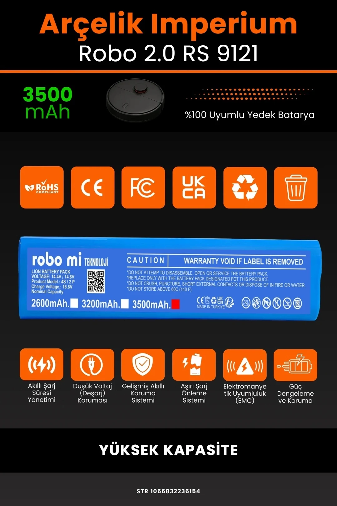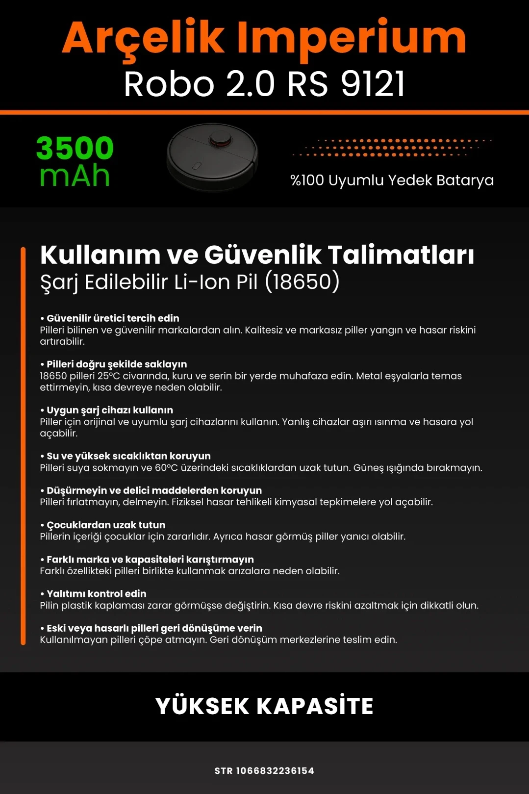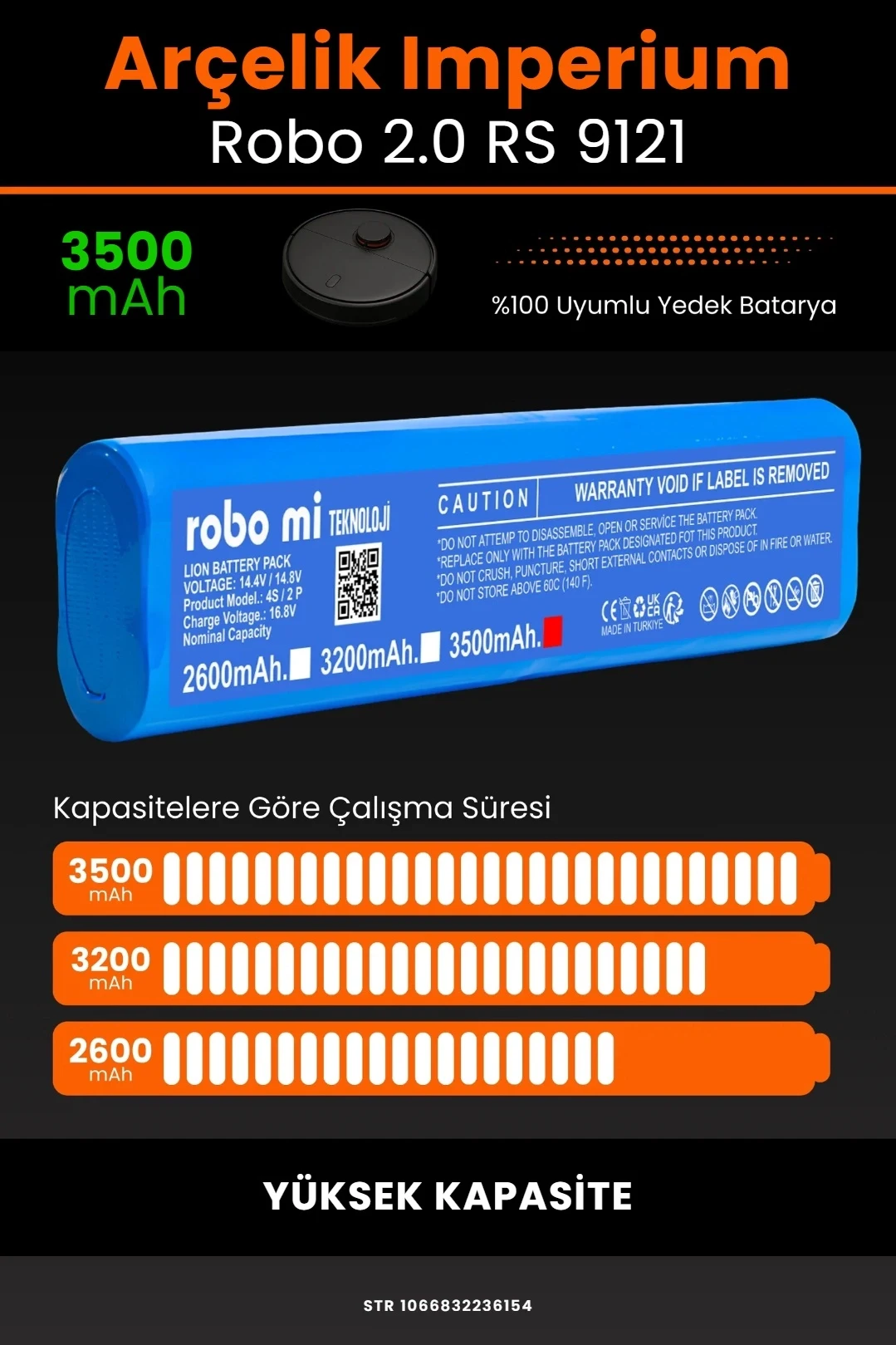 ■ ROBO Mİ ARÇELİK İMPERİUM ROBO 2.0 RS 9121 UYUMLU YÜKSEK KAPASİTELİ ROBOT SÜPÜRGE BATARYASI