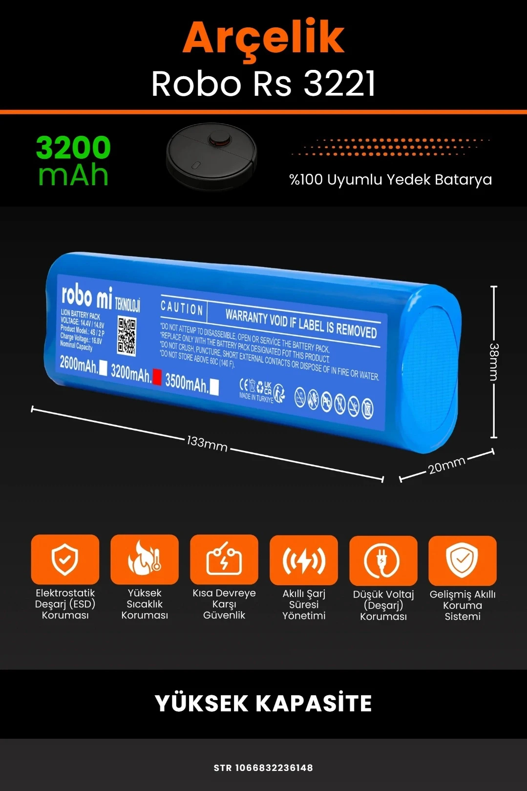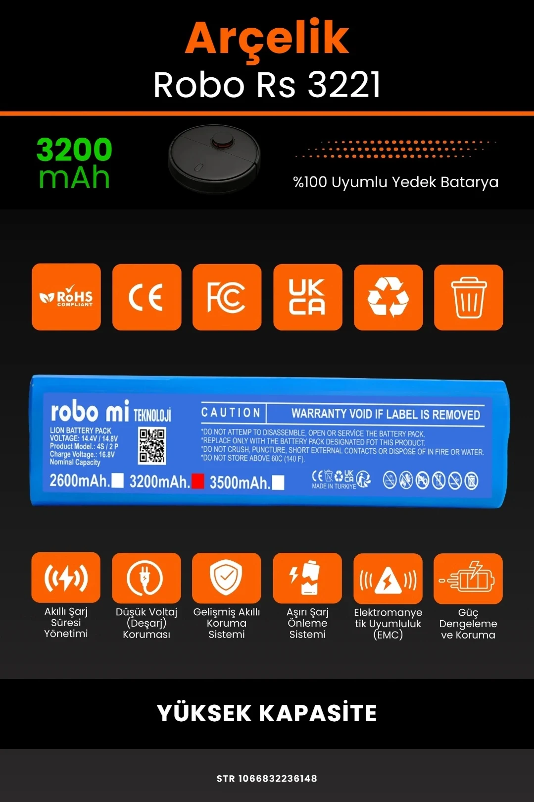 robo mi tarafından geliştirilen Arçelik Imperium Robo RS 3221 uyumlu 3200mAh yedek batarya, robot süpürgenizin ihtiyaç duyduğu enerjiyi güvenli, dengeli ve uzun ömürlü şekilde sağlayacak biçimde üretilmiştir. Cihazınızın fabrika çıkış enerji değerlerine uygun tasarlanan bu batarya, performans sürekliliğini korurken temizlik verimliliğini artırır.