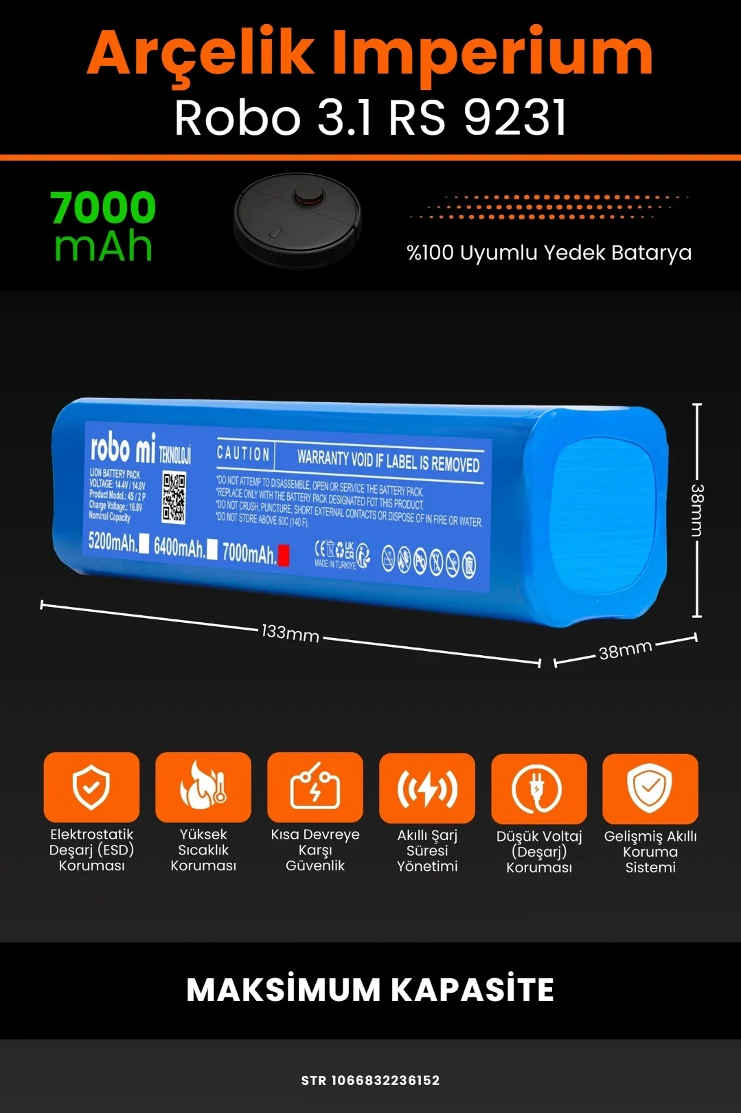 robo mi tarafından üretilen Arçelik Imperium Uyumlu Robo 3.1 RS 9231 robot süpürge bataryası, cihazınızın ihtiyaç duyduğu enerji performansını güvenilir şekilde karşılamak üzere geliştirilmiştir. Orijinal kapasite standartlarına uygun yapısı sayesinde robot süpürgenizin çalışma sistemine tam uyum sağlar ve temizlik süreçlerinde dengeli güç sunar.