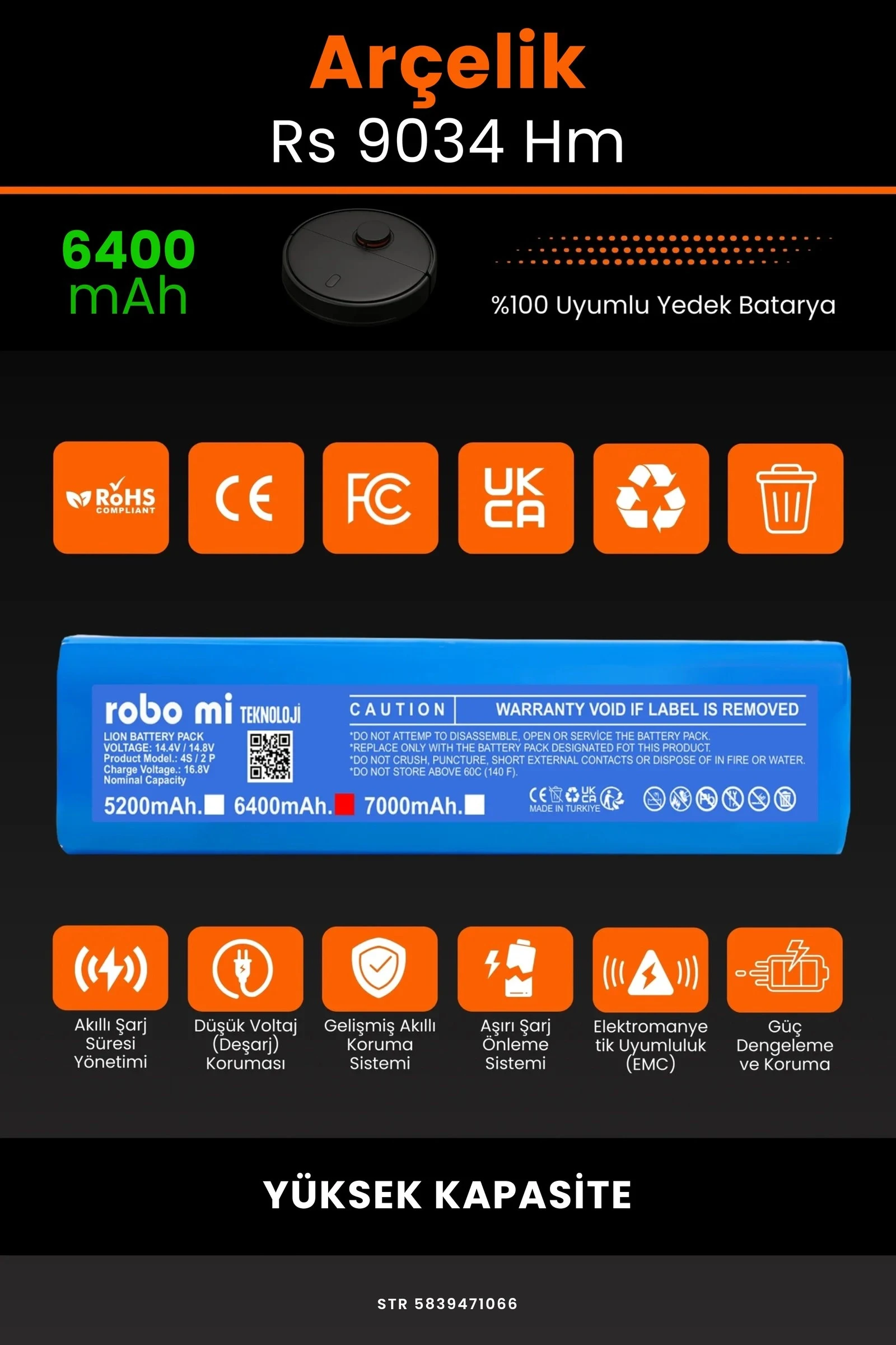 Robot süpürgenizin temizlik gücünü yeniden keşfetmeye hazır olun. Zamanla performansı azalan, şarjı çabuk tükenen robot süpürgeler için özel olarak geliştirilen 6400 batarya, Arçelik Rs 9034 Hm modelinizle tam uyum içinde çalışarak cihazınıza uzun ömür ve istikrarlı enerji sağlar.