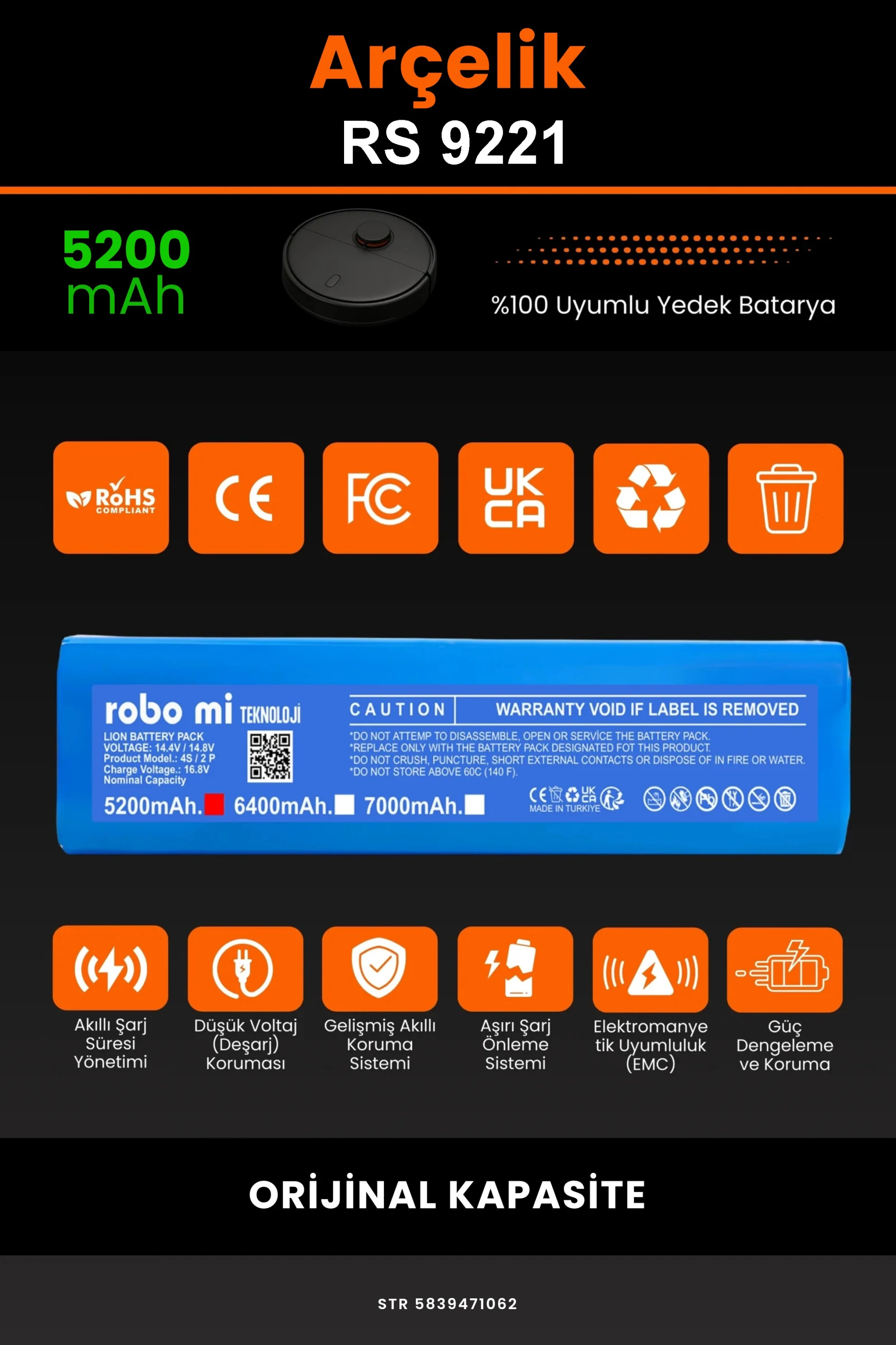 Robot süpürgenizin temizlik gücünü yeniden keşfetmeye hazır olun. Zamanla performansı azalan, şarjı çabuk tükenen robot süpürgeler için özel olarak geliştirilen 6400mAh batarya, Arçelik Rs 9121 Hm modelinizle tam uyum içinde çalışarak cihazınıza uzun ömür ve istikrarlı enerji sağlar.