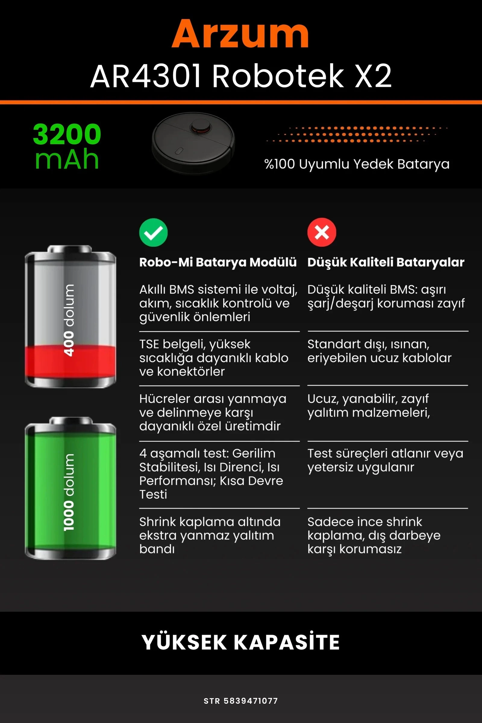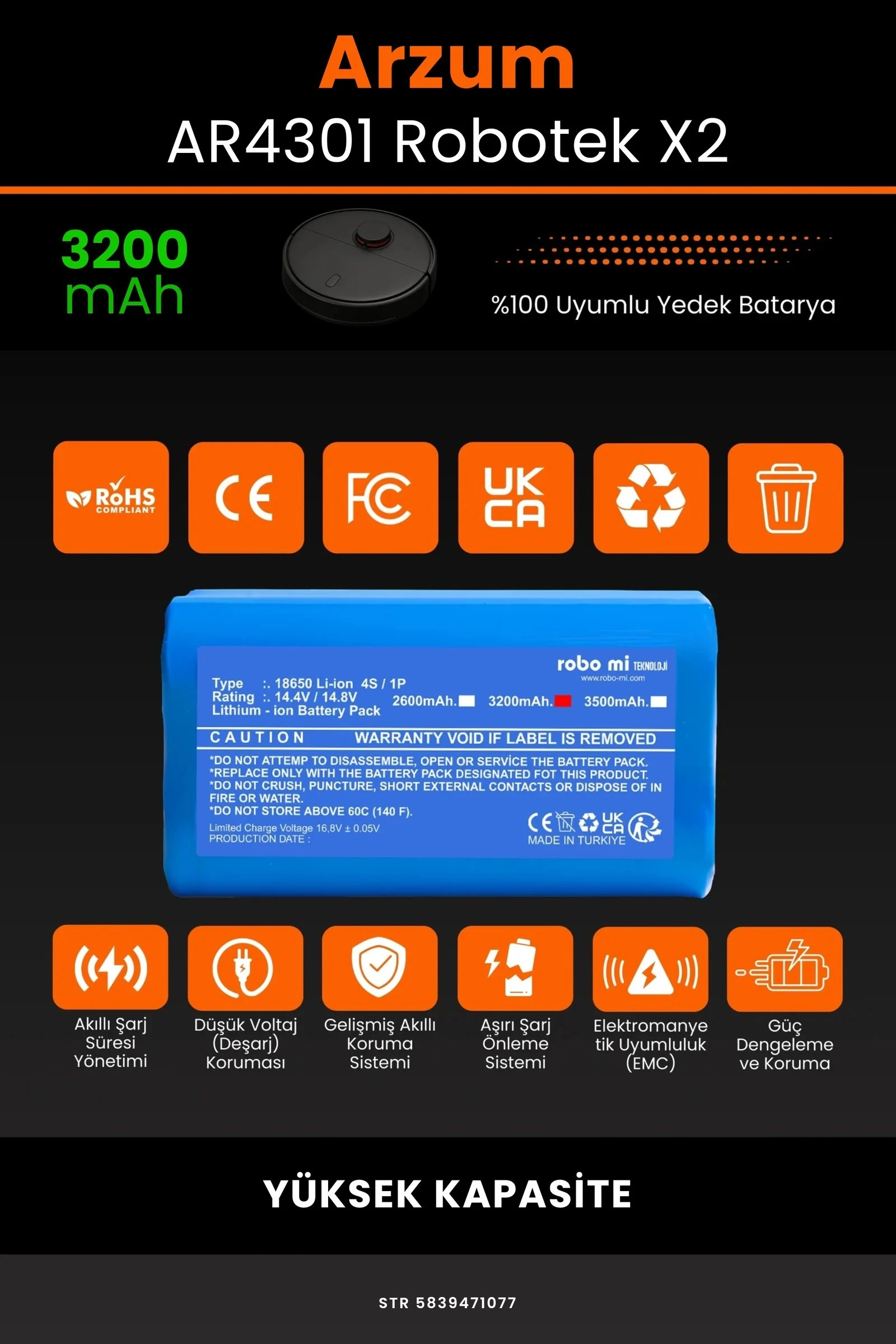 Robot süpürgenizin temizlik gücünü yeniden keşfetmeye hazır olun. Zamanla performansı azalan, şarjı çabuk tükenen robot süpürgeler için özel olarak geliştirilen 3200 batarya, Arzum AR4301 Robotek X2 modelinizle tam uyum içinde çalışarak cihazınıza uzun ömür ve istikrarlı enerji sağlar.