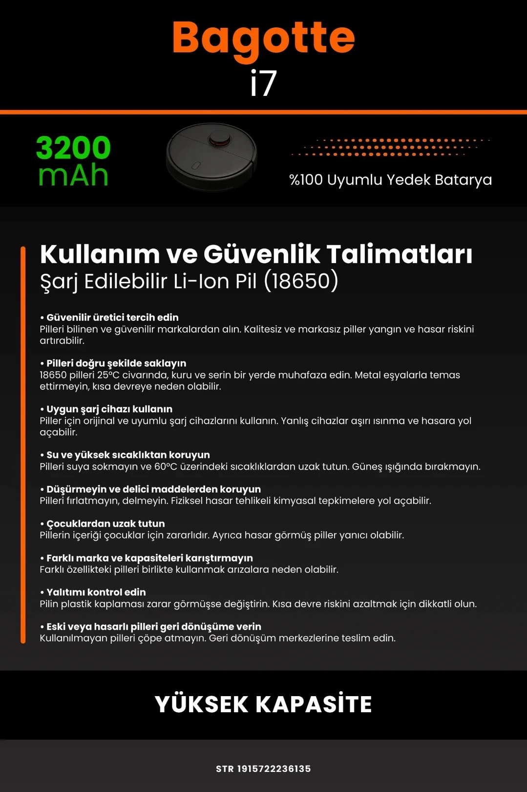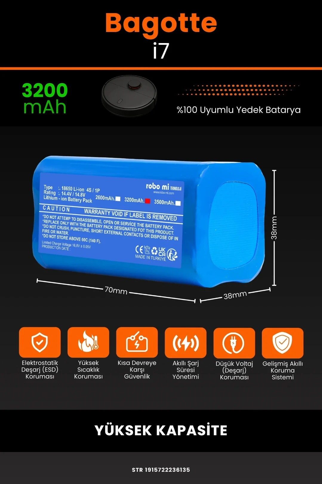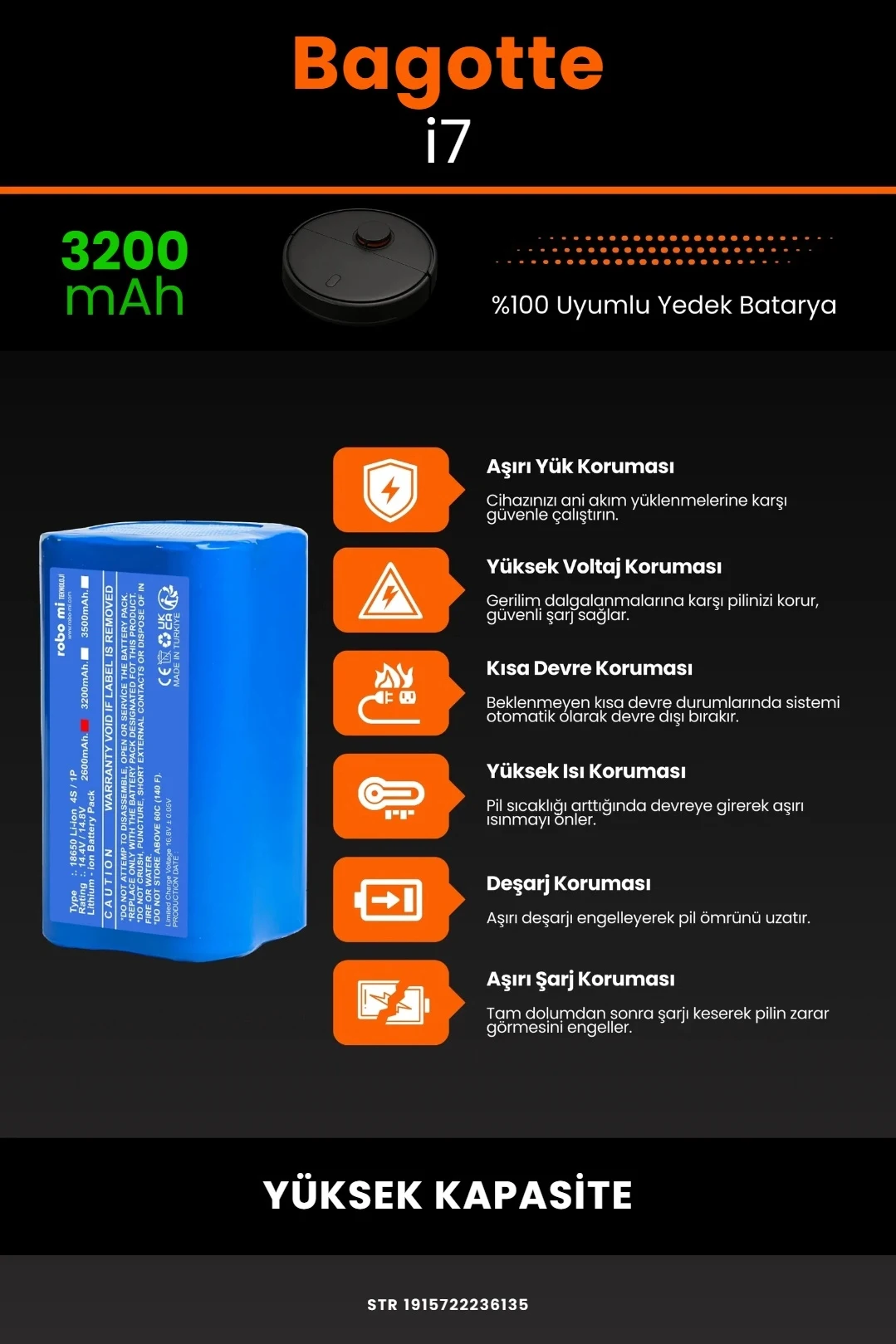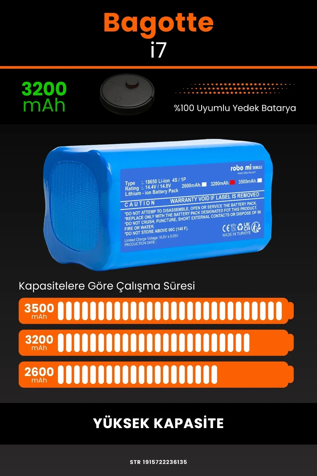 Robo-mi Teknoloji tarafından geliştirilen BAGOTTE İ7 uyumlu robot süpürge bataryaları, yüksek kalite standartları ve ileri teknoloji üretim süreçleri ile kullanıcıya maksimum performans sunmak üzere tasarlanmıştır.