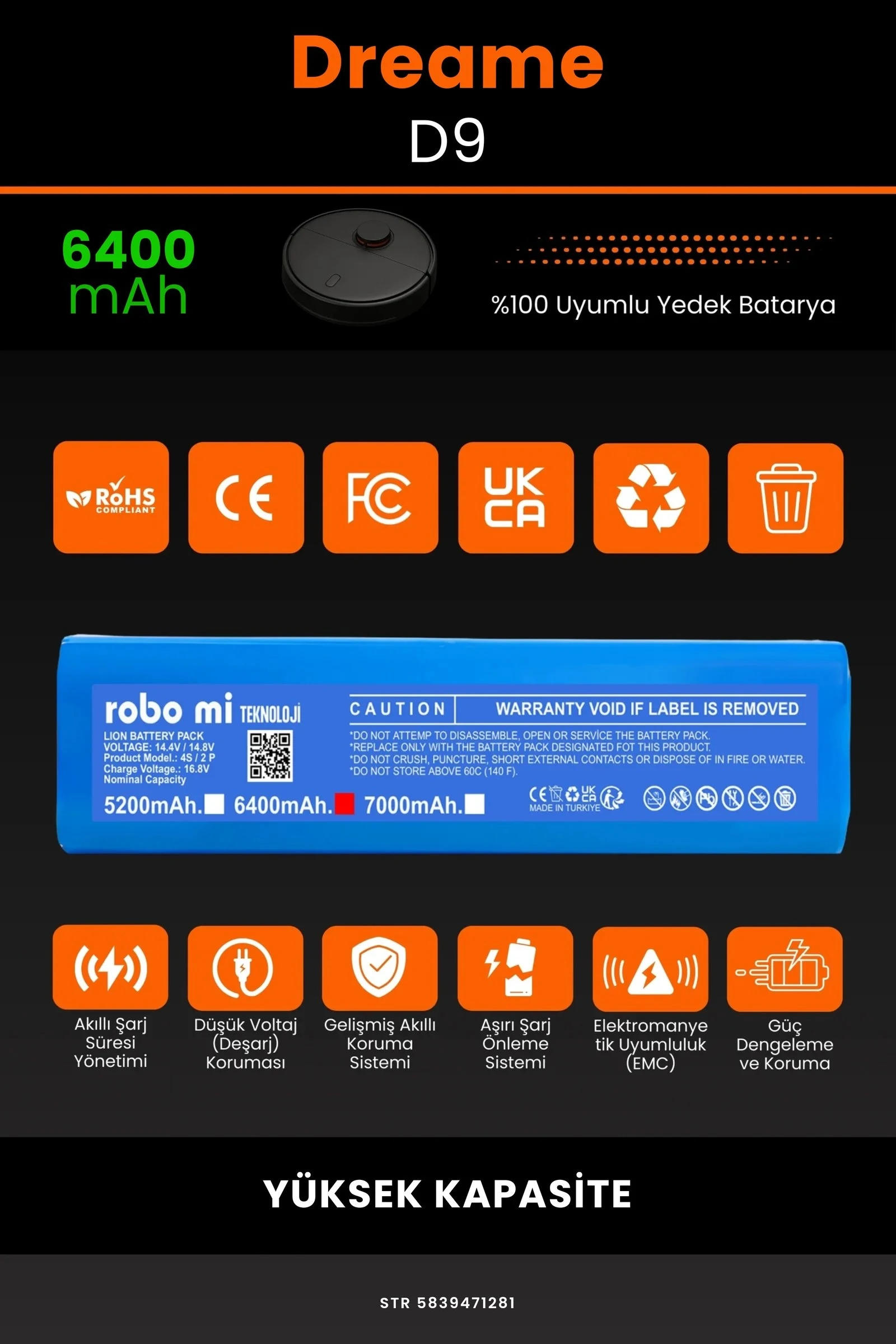 Robot süpürgenizin temizlik gücünü yeniden keşfetmeye hazır olun. Zamanla performansı azalan, şarjı çabuk tükenen robot süpürgeler için özel olarak geliştirilen 6400 batarya, Dreame Vacuum Mop D9 modelinizle tam uyum içinde çalışarak cihazınıza uzun ömür ve istikrarlı enerji sağlar.