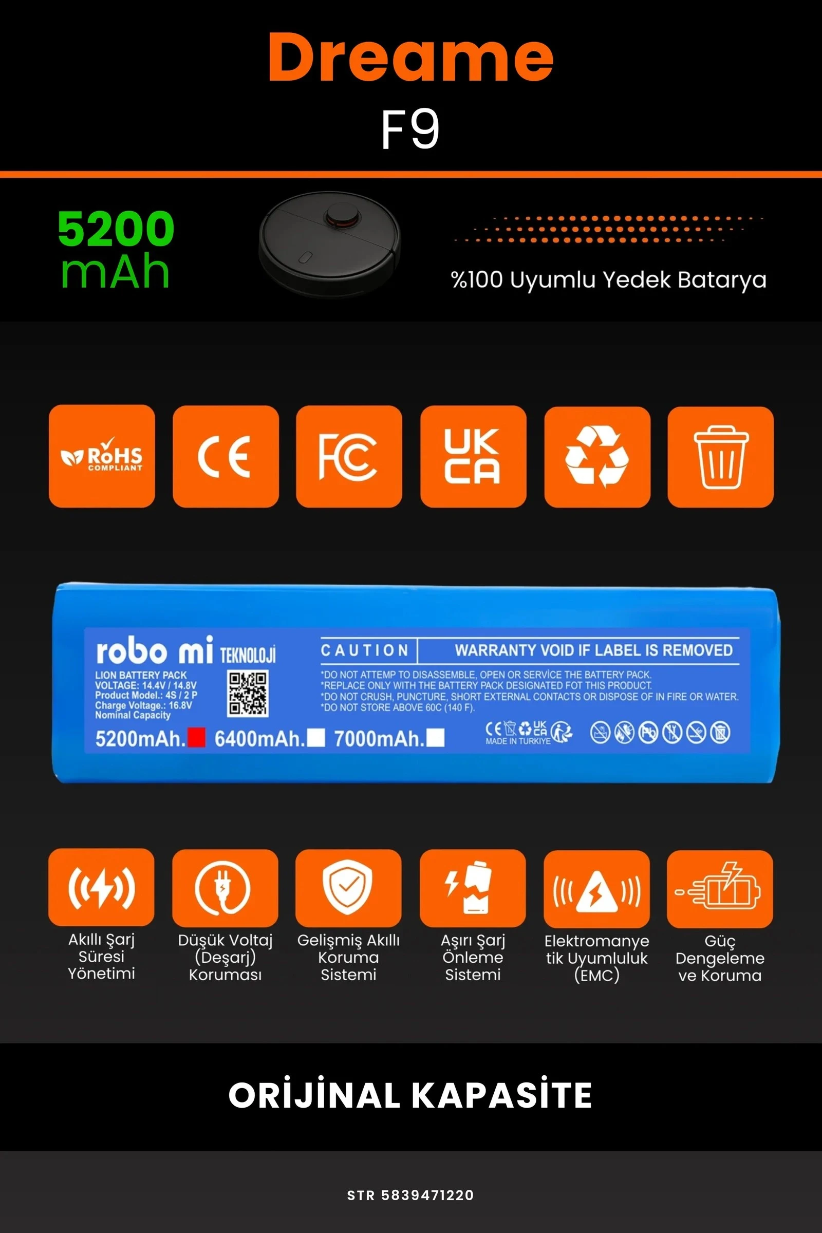 Robot süpürgenizin temizlik gücünü yeniden keşfetmeye hazır olun. Zamanla performansı azalan, şarjı çabuk tükenen robot süpürgeler için özel olarak geliştirilen 5200mAh batarya, Robo-Mi Dreame F9 Vacuum Mop modelinizle tam uyum içinde çalışarak cihazınıza uzun ömür ve istikrarlı enerji sağlar.