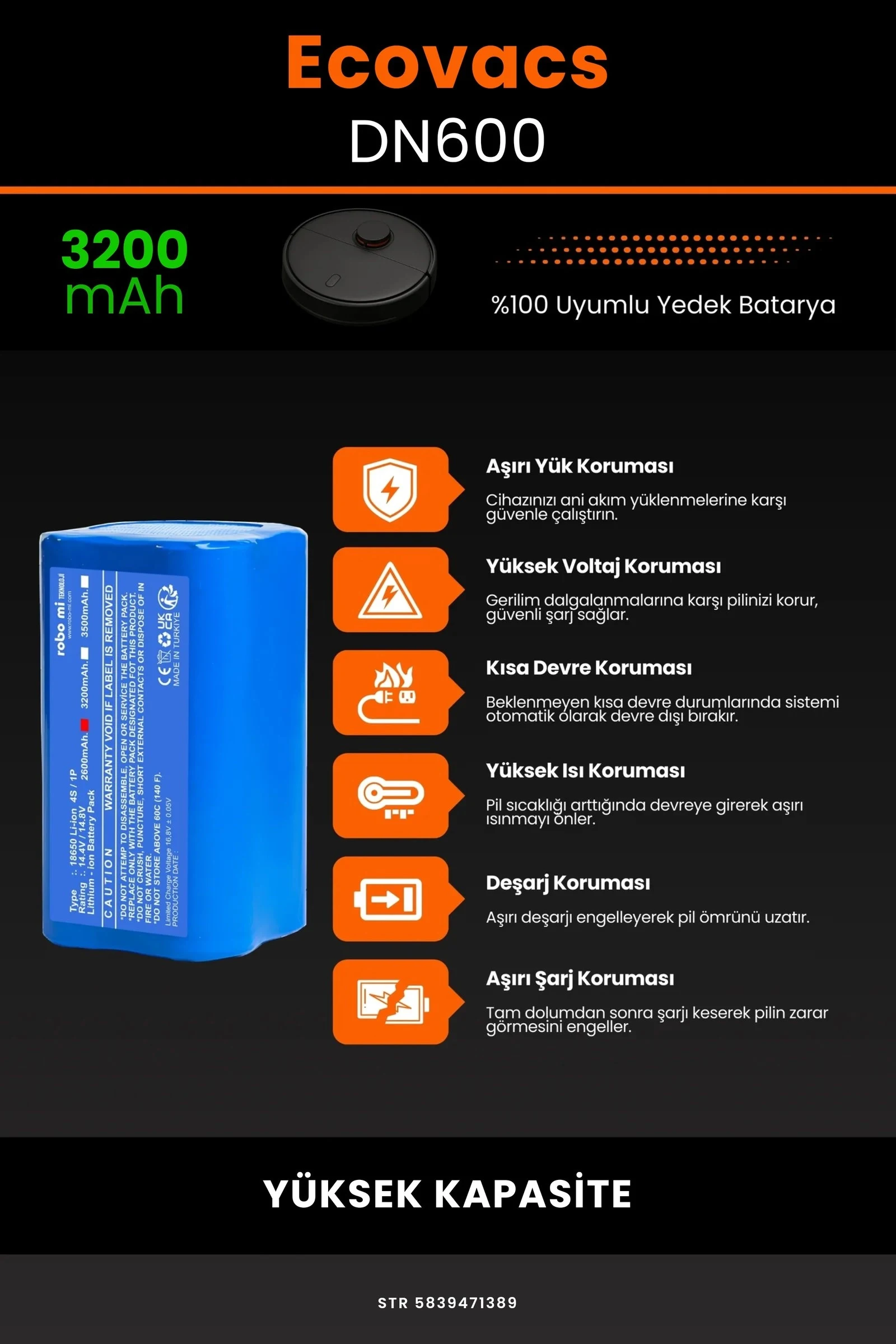 Robot süpürgenizin temizlik gücünü yeniden keşfetmeye hazır olun. Zamanla performansı azalan, şarjı çabuk tükenen robot süpürgeler için özel olarak geliştirilen 3200 batarya, Ecovacs Deebot DN600 modelinizle tam uyum içinde çalışarak cihazınıza uzun ömür ve istikrarlı enerji sağlar.
