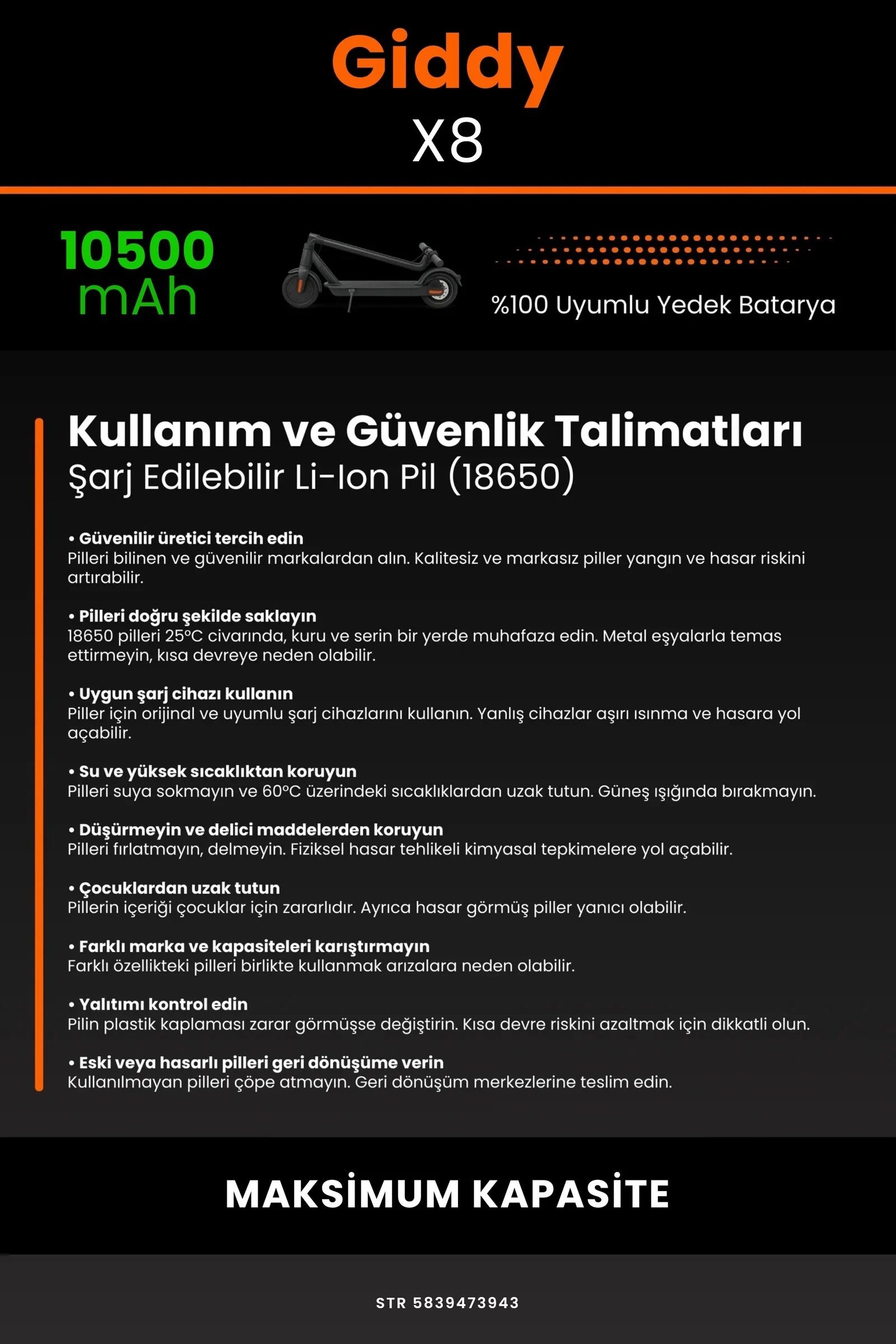 Elektrikli scooter'ınızın sürüş deneyimini yeniden keşfetmeye hazır olun. Zamanla menzili azalan, şarjı çabuk tükenen elektrikli scooterlar için özel olarak geliştirilen 36V - 10500.mAh batarya, Robo-Mi Giddy X8 modelinizle tam uyum içinde çalışarak aracınıza uzun menzil ve güvenilir enerji sağlar.