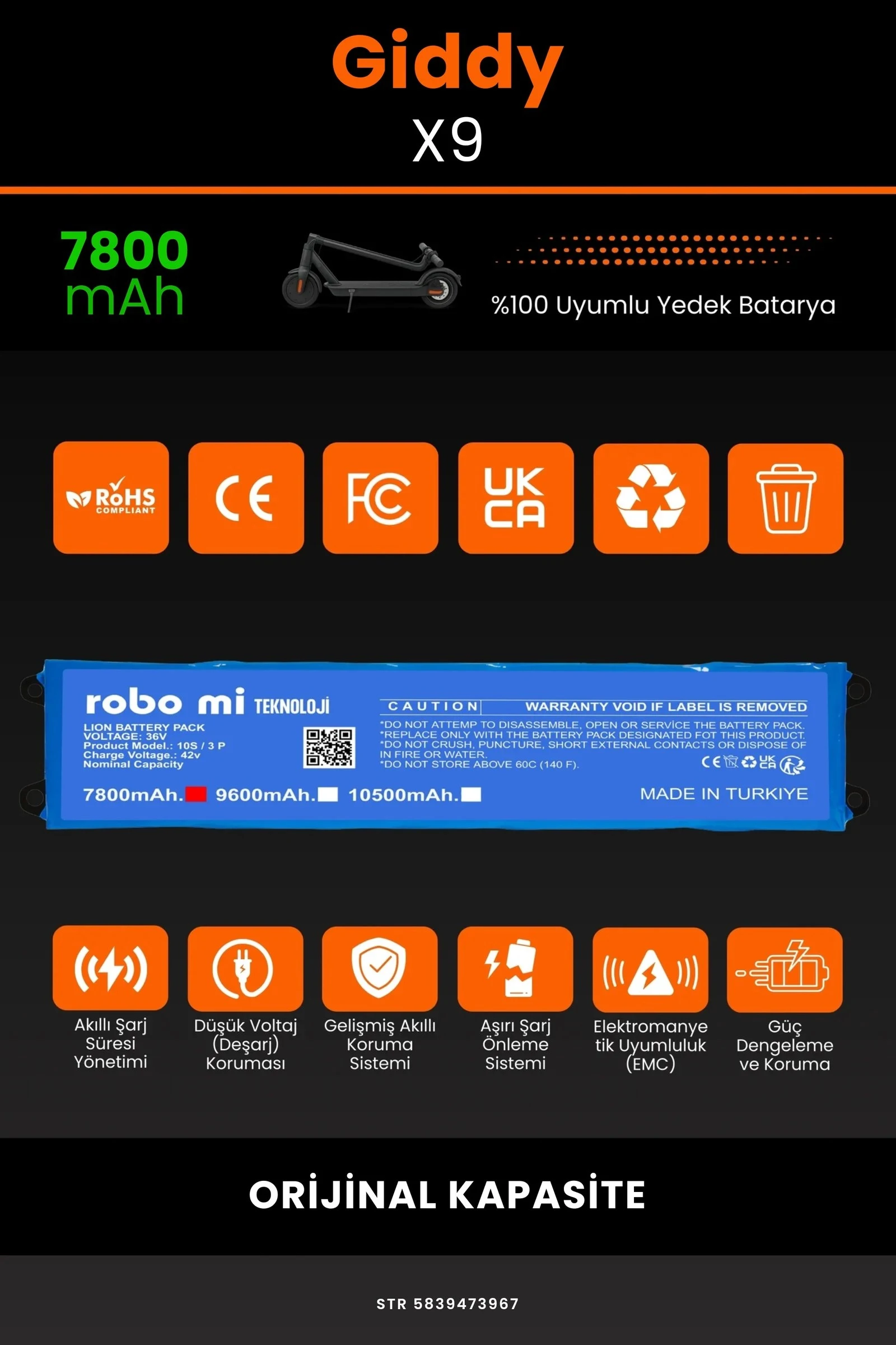 <p style="font-family: 'Poppins', sans-serif; font-size: 14px; line-height: 1.6; color: #374151; margin-bottom: 10px; font-weight: normal;">Robo-Mi Giddy X9 / 36V 7800mAh Elektrikli Scooter Bataryası - Gerçek Kapasite, Maksimum Güvenlik 7800mAh Elektrikli Scooter Bataryası</p>