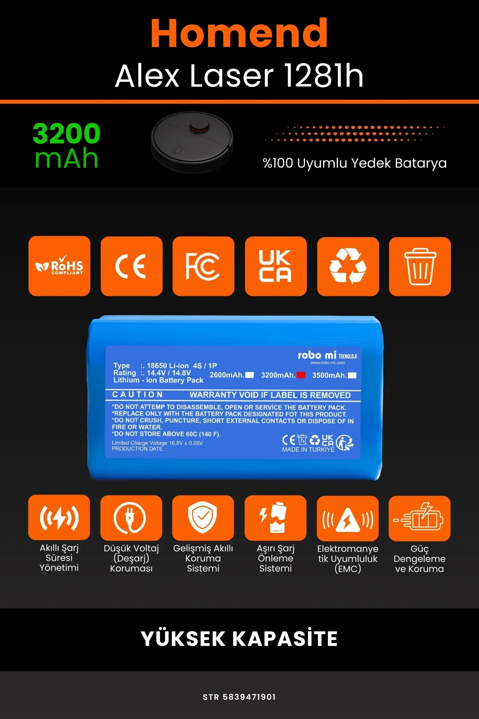 Robot süpürgenizin temizlik gücünü yeniden keşfetmeye hazır olun. Zamanla performansı azalan, şarjı çabuk tükenen robot süpürgeler için özel olarak geliştirilen 3200 batarya, Homend Alex Laser 1281h modelinizle tam uyum içinde çalışarak cihazınıza uzun ömür ve istikrarlı enerji sağlar.
