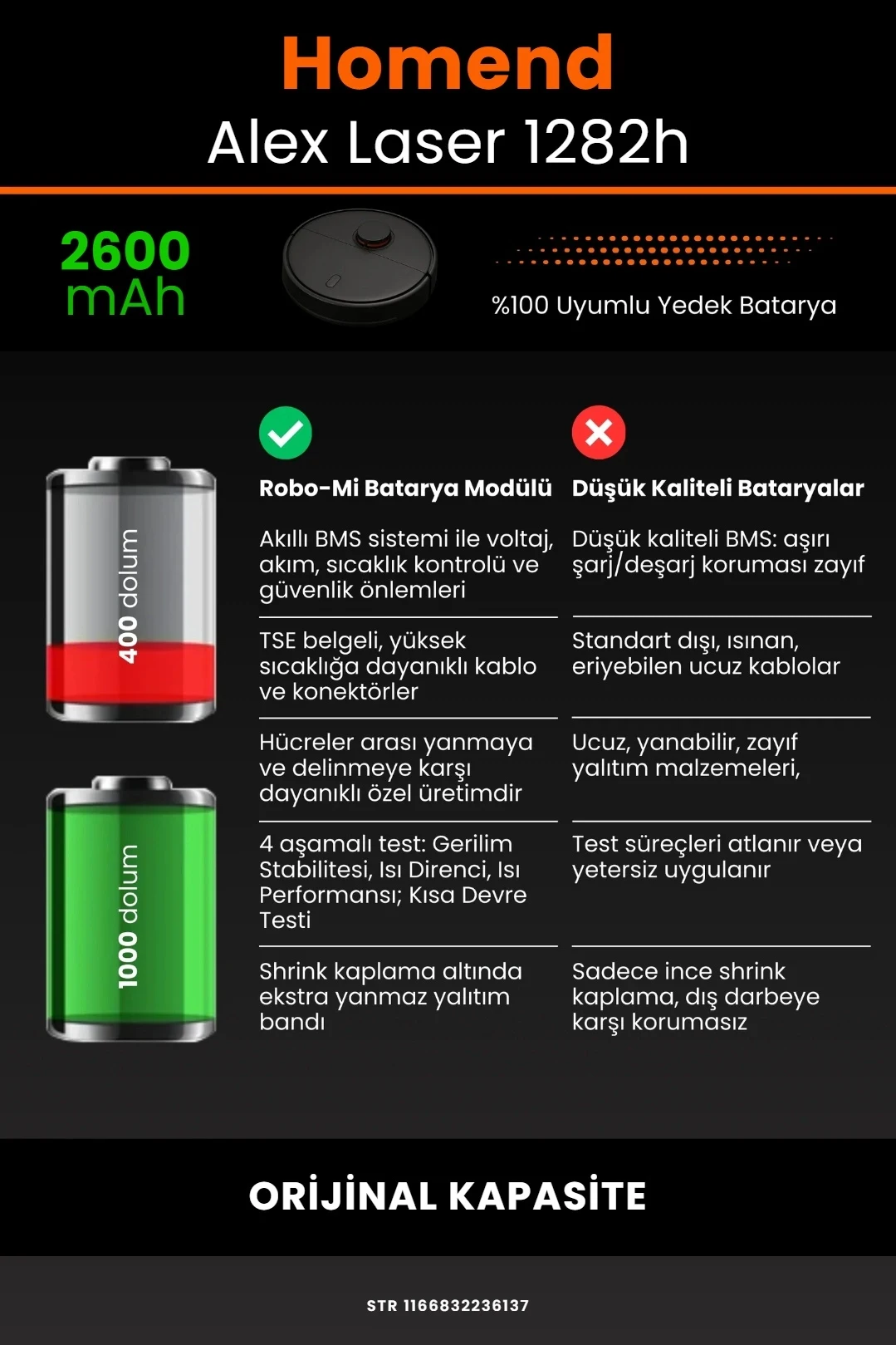 Homend Alex Laser 1282h 2600mAh Robot Süpürge Bataryası - Gerçek Kapasite, Maksimum Güvenlik