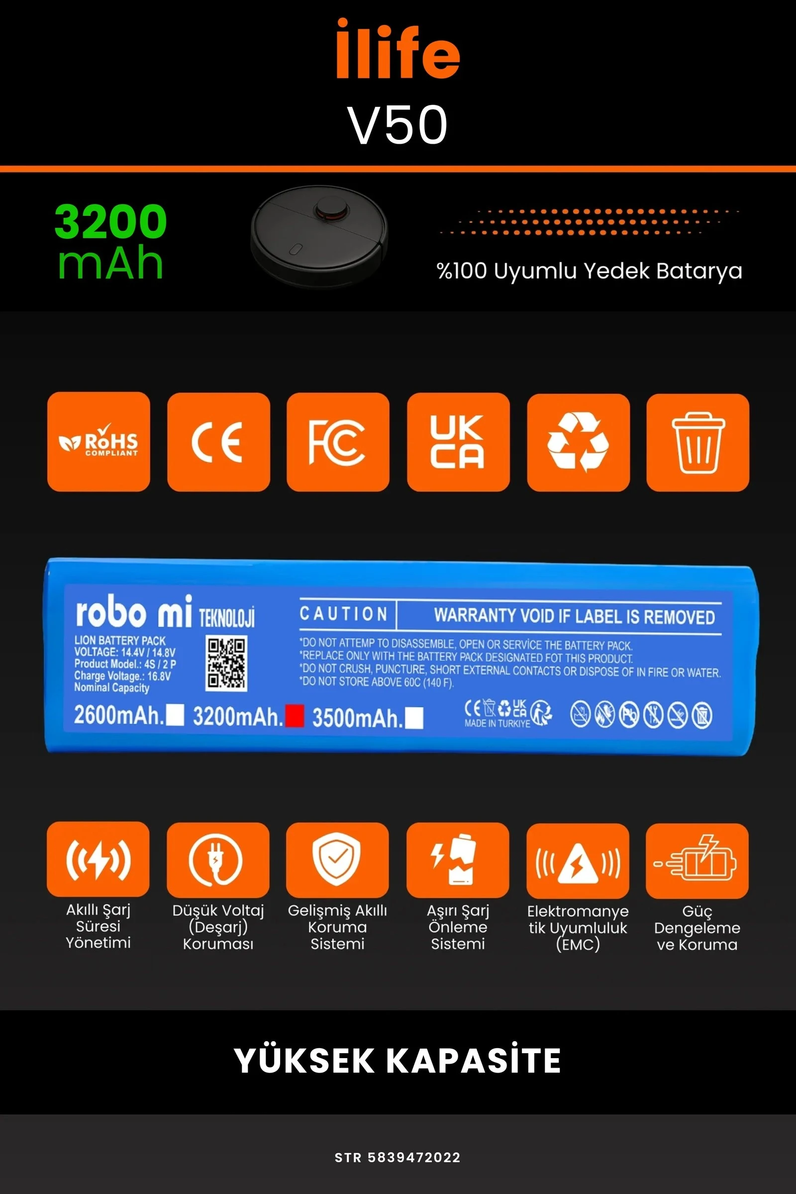 Robot süpürgenizin temizlik gücünü yeniden keşfetmeye hazır olun. Zamanla performansı azalan, şarjı çabuk tükenen robot süpürgeler için özel olarak geliştirilen 3200 batarya, İlife V50 modelinizle tam uyum içinde çalışarak cihazınıza uzun ömür ve istikrarlı enerji sağlar.