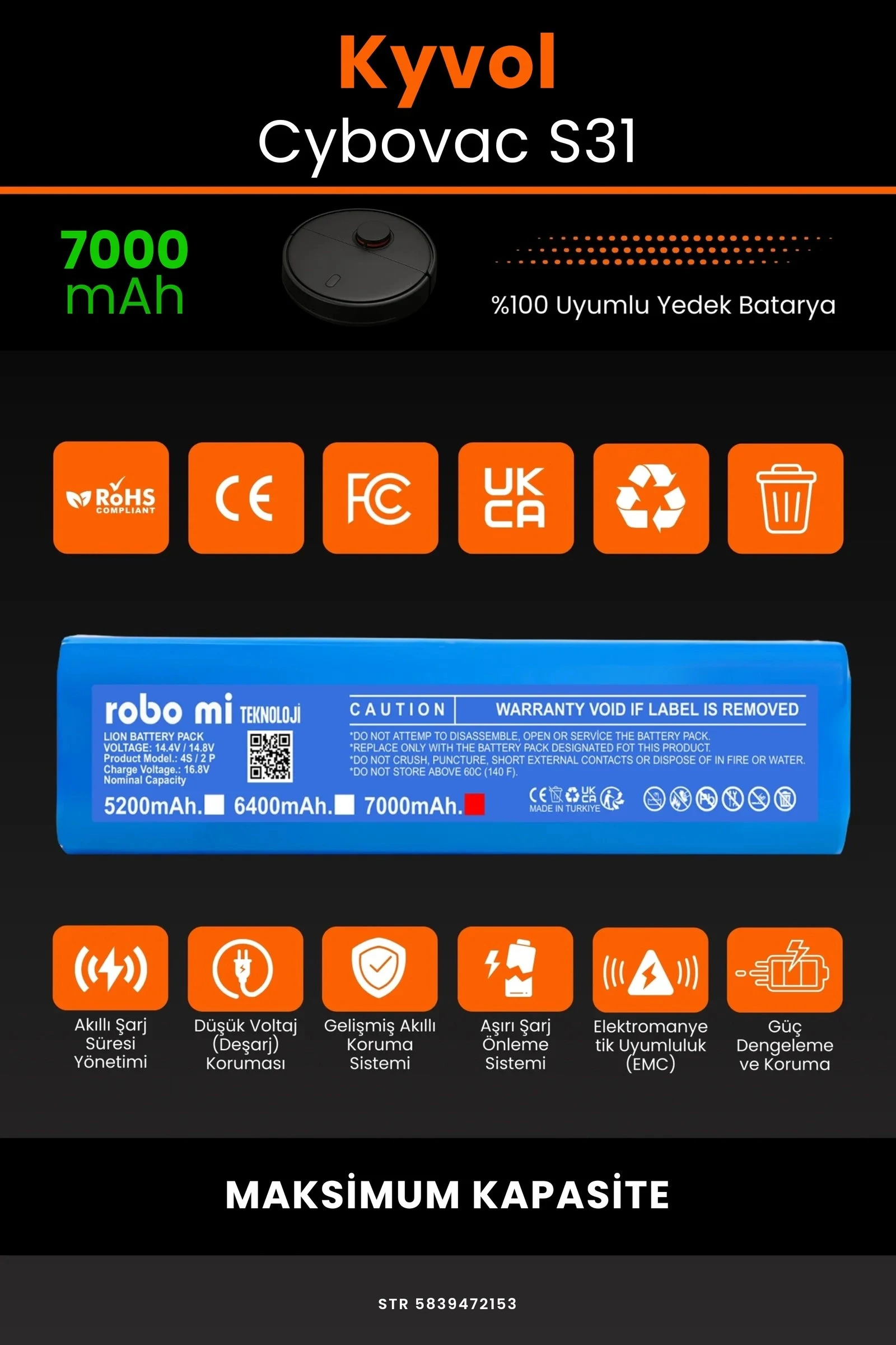 Robot süpürgenizin temizlik gücünü yeniden keşfetmeye hazır olun. Zamanla performansı azalan, şarjı çabuk tükenen robot süpürgeler için özel olarak geliştirilen 7000 batarya, Kyvol Cybovac S31 modelinizle tam uyum içinde çalışarak cihazınıza uzun ömür ve istikrarlı enerji sağlar.