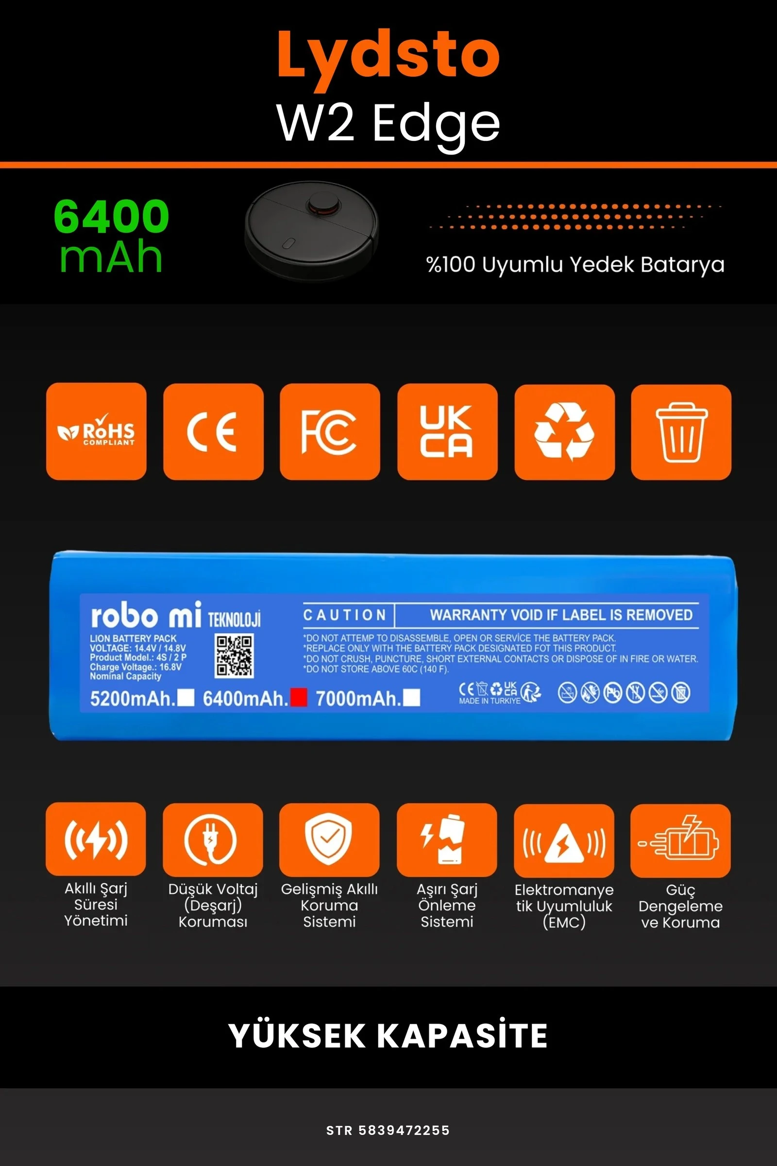 Robot süpürgenizin temizlik gücünü yeniden keşfetmeye hazır olun. Zamanla performansı azalan, şarjı çabuk tükenen robot süpürgeler için özel olarak geliştirilen 6400 batarya, Lydsto W2 Edge modelinizle tam uyum içinde çalışarak cihazınıza uzun ömür ve istikrarlı enerji sağlar.