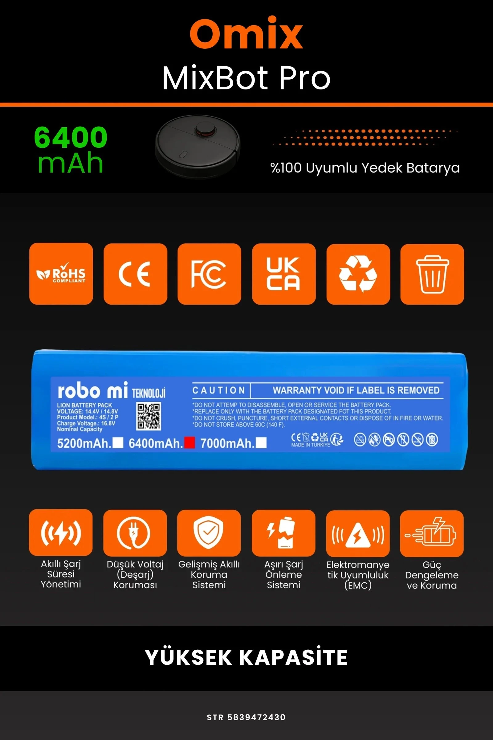 Robot süpürgenizin temizlik gücünü yeniden keşfetmeye hazır olun. Zamanla performansı azalan, şarjı çabuk tükenen robot süpürgeler için özel olarak geliştirilen 6400 batarya, Omix MixBot Pro modelinizle tam uyum içinde çalışarak cihazınıza uzun ömür ve istikrarlı enerji sağlar.