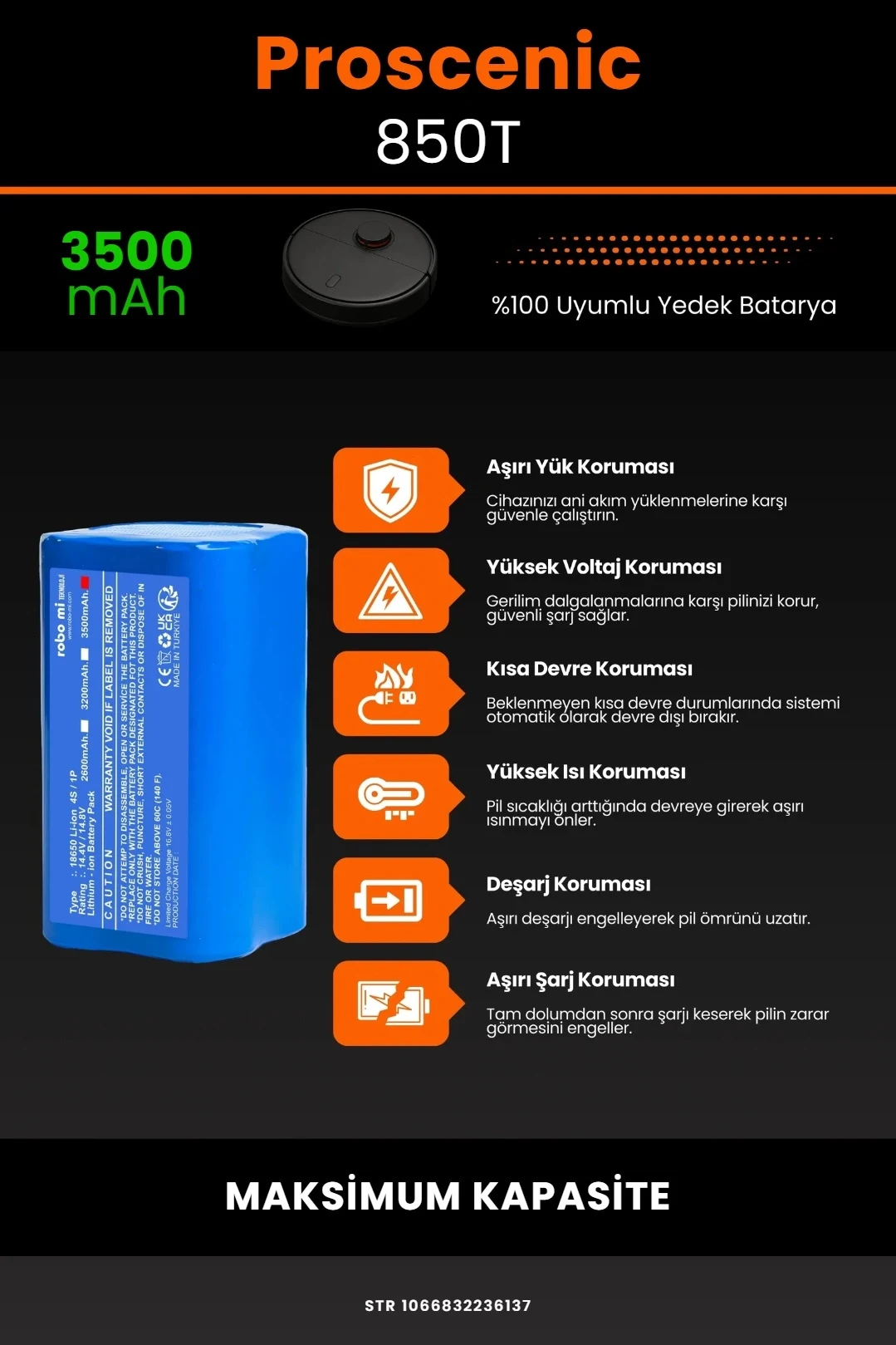 Proscenic 850T Uyumlu Robot Süpürge Bataryası, robot süpürgenizin temizlik performansını artırmak ve çalışma süresini uzatmak amacıyla geliştirilmiş yüksek kaliteli bir yedek pil çözümüdür. Güçlü enerji kapasitesi sayesinde cihazınızın daha uzun süre kesintisiz çalışmasını sağlar ve temizlik verimliliğini maksimum seviyeye taşır.