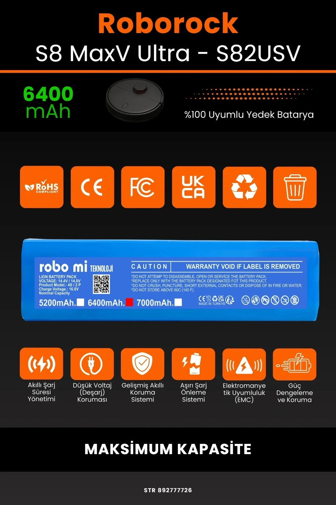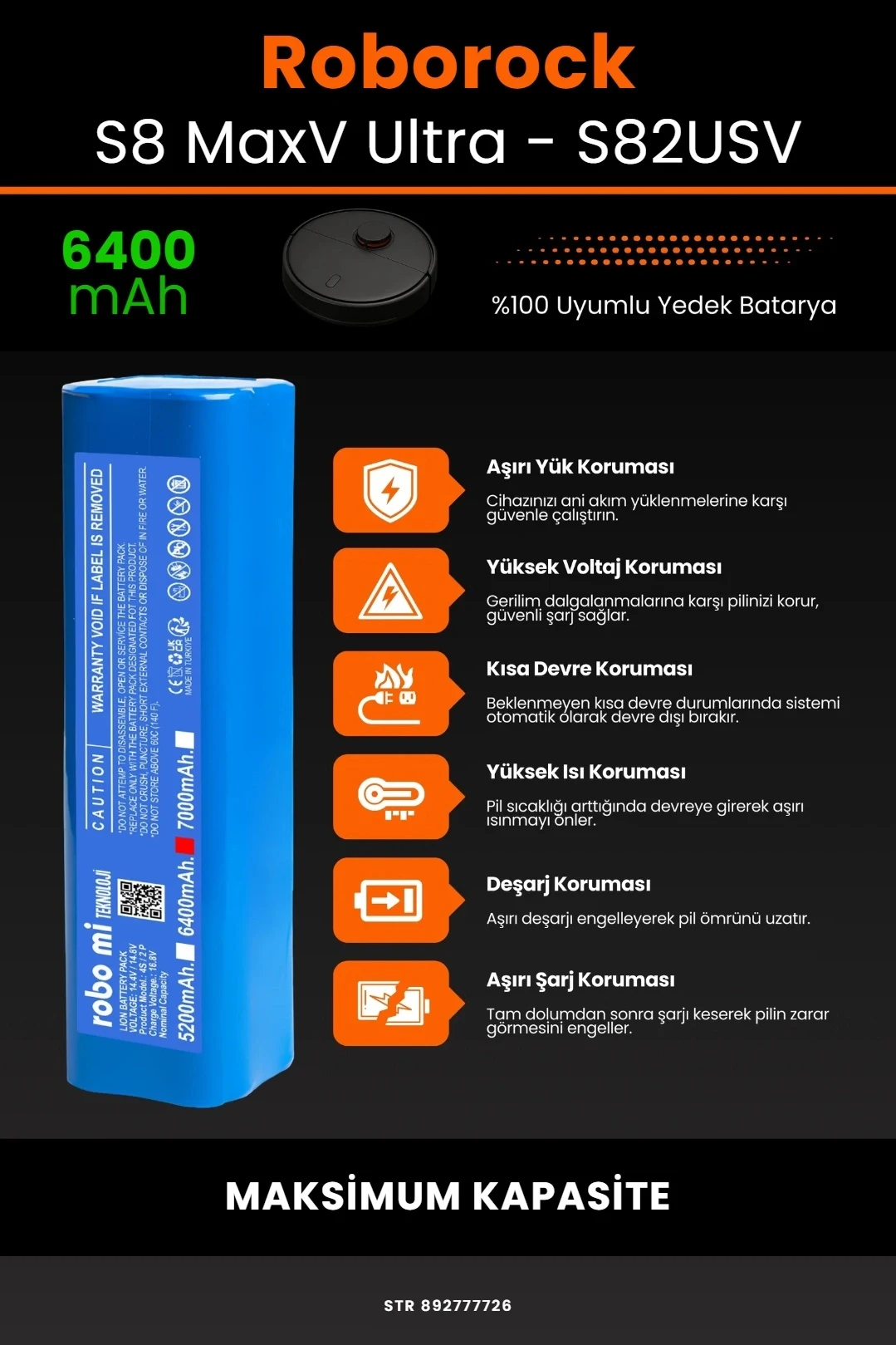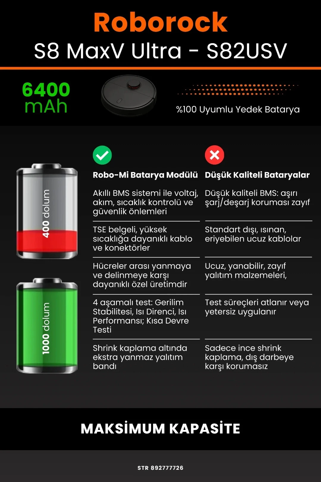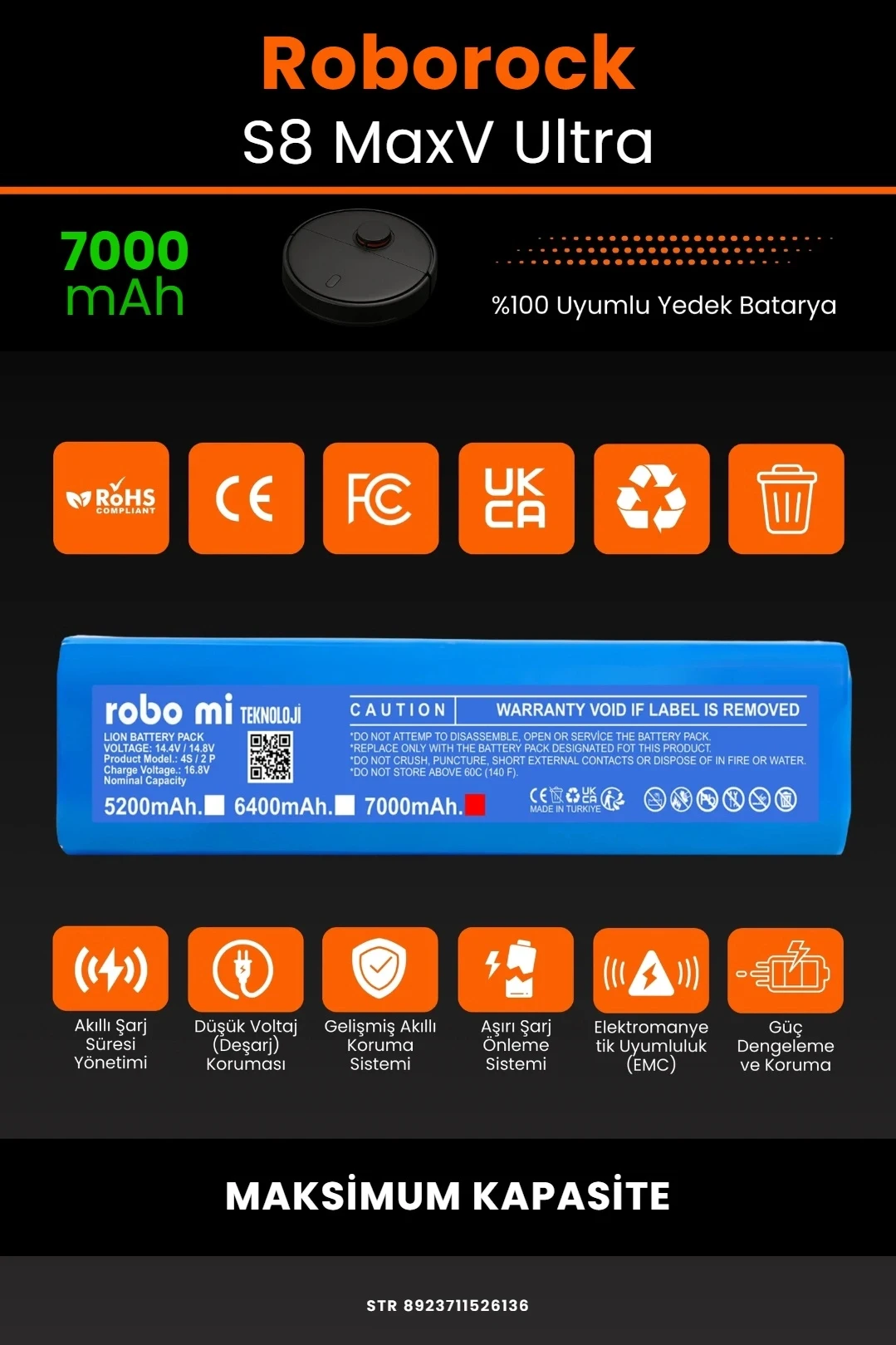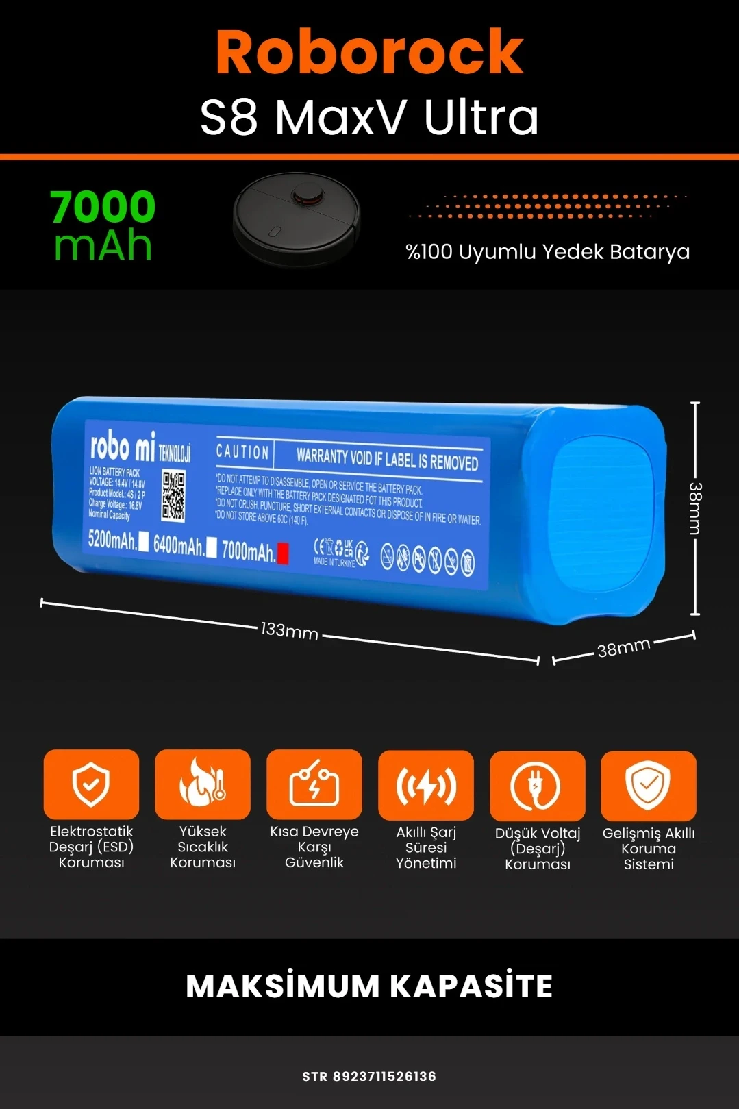 Robot süpürgenizin temizlik gücünü yeniden keşfetmeye hazır olun. Zamanla performansı azalan, şarjı çabuk tükenen robot süpürgeler için özel olarak geliştirilen 7000 batarya, Roborock S8 Maxv Ultra modelinizle tam uyum içinde çalışarak cihazınıza uzun ömür ve istikrarlı enerji sağlar.