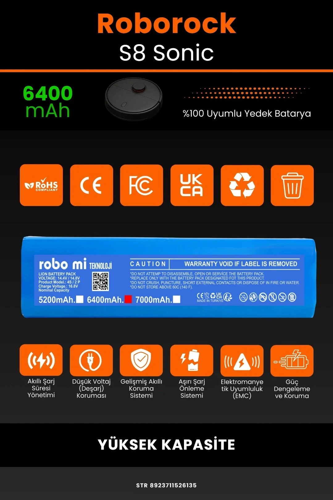 Roborock S8 Sonic model robot süpürgeniz için özel olarak geliştirilen 6400mAh yüksek kapasiteli Li-ion batarya ile cihazınızı ilk günkü performansına geri döndürün. Gerçek kapasite, gelişmiş güvenlik sistemleri ve uzun ömürlü hücre yapısı sayesinde kesintisiz ve güçlü temizlik deneyimi yaşayın.