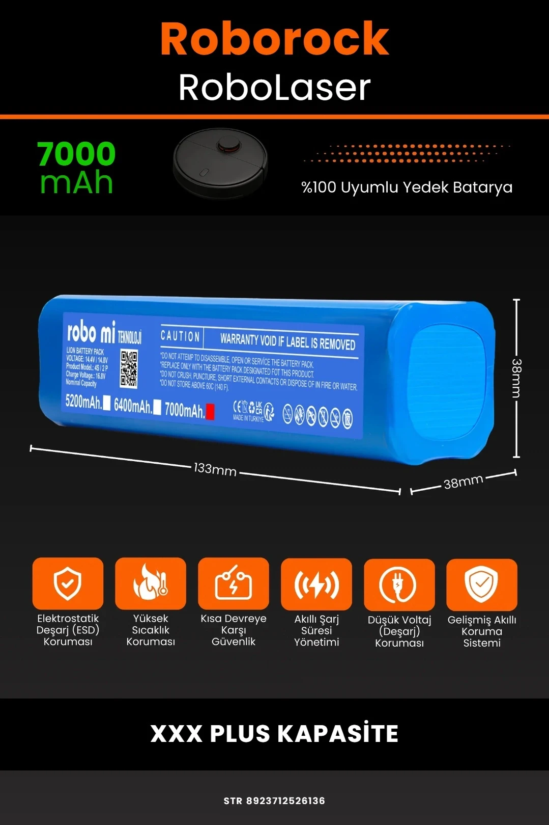 Robot süpürgenizin temizlik gücünü yeniden keşfetmeye hazır olun. Zamanla performansı azalan, şarjı çabuk tükenen robot süpürgeler için özel olarak geliştirilen 7000mAh XXXL Plus Kapasiteli batarya, Robotuya RoboLaser modelinizle tam uyum içinde çalışarak cihazınıza uzun ömür ve istikrarlı enerji sağlar.