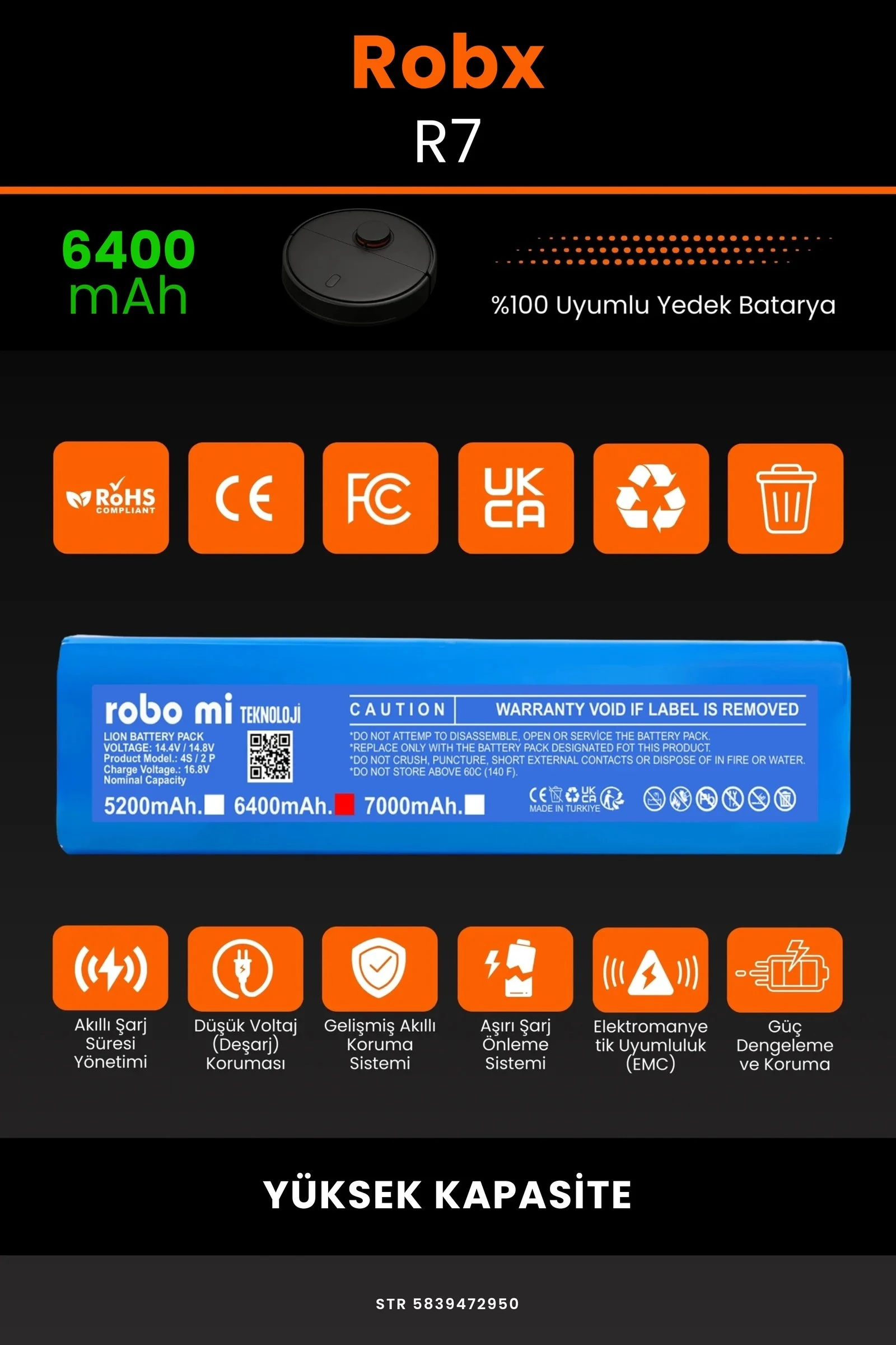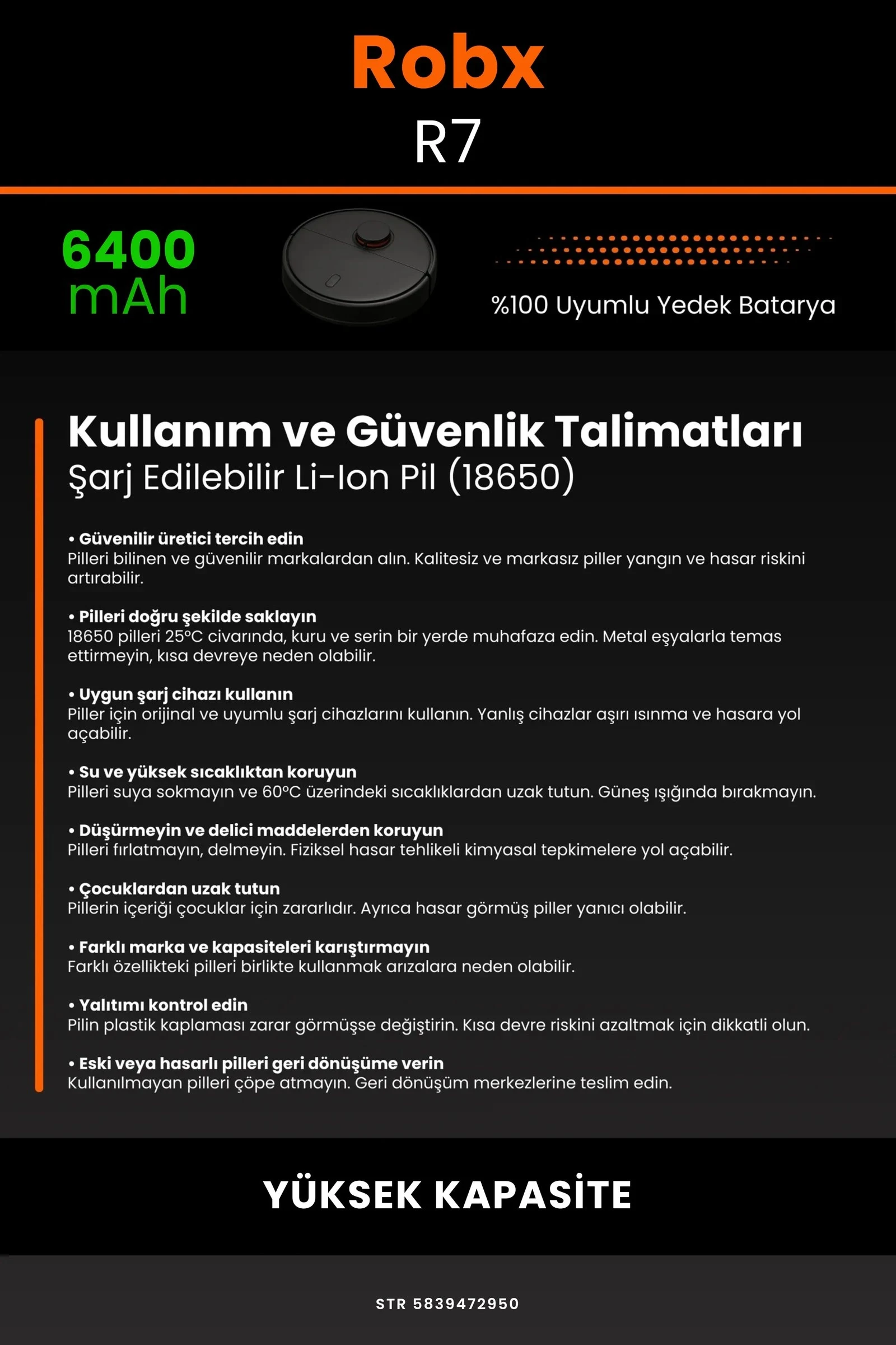 Robot süpürgenizin temizlik gücünü yeniden keşfetmeye hazır olun. Zamanla performansı azalan, şarjı çabuk tükenen robot süpürgeler için özel olarak geliştirilen 6400 batarya, Robx R7 modelinizle tam uyum içinde çalışarak cihazınıza uzun ömür ve istikrarlı enerji sağlar.