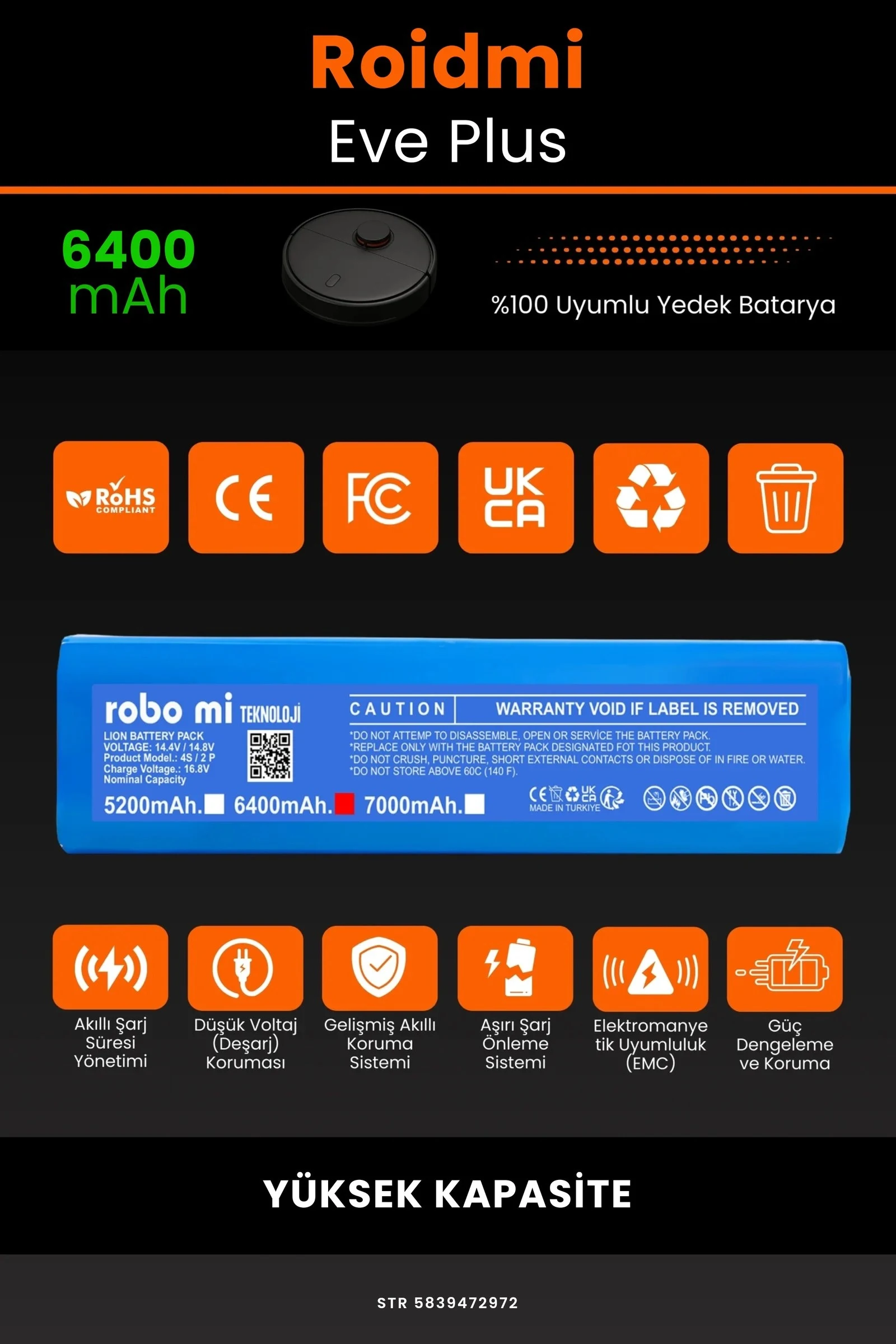 Robot süpürgenizin temizlik gücünü yeniden keşfetmeye hazır olun. Zamanla performansı azalan, şarjı çabuk tükenen robot süpürgeler için özel olarak geliştirilen 6400 batarya, Roidmi Eve Plus modelinizle tam uyum içinde çalışarak cihazınıza uzun ömür ve istikrarlı enerji sağlar.