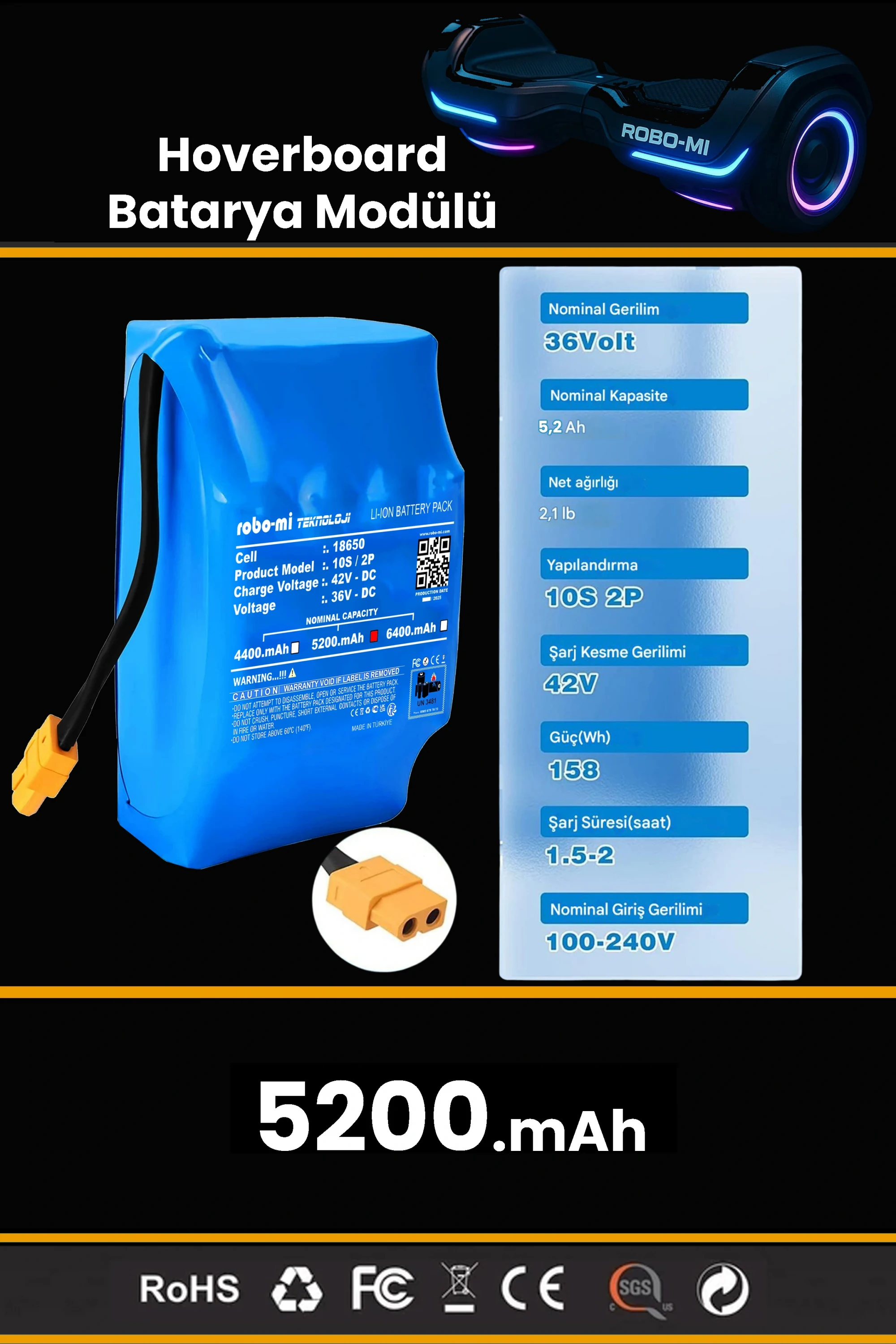 ROBO Mi 36V 5200mAh Hoverboard Batarya, orijinal kalite standartlarında üretilmiştir. Elektrikli kaykayınızın performansını artırmak, daha uzun süre sürüş keyfi yaşamak ve güvenli bir enerji çözümü elde etmek için en uygun tercihtir.