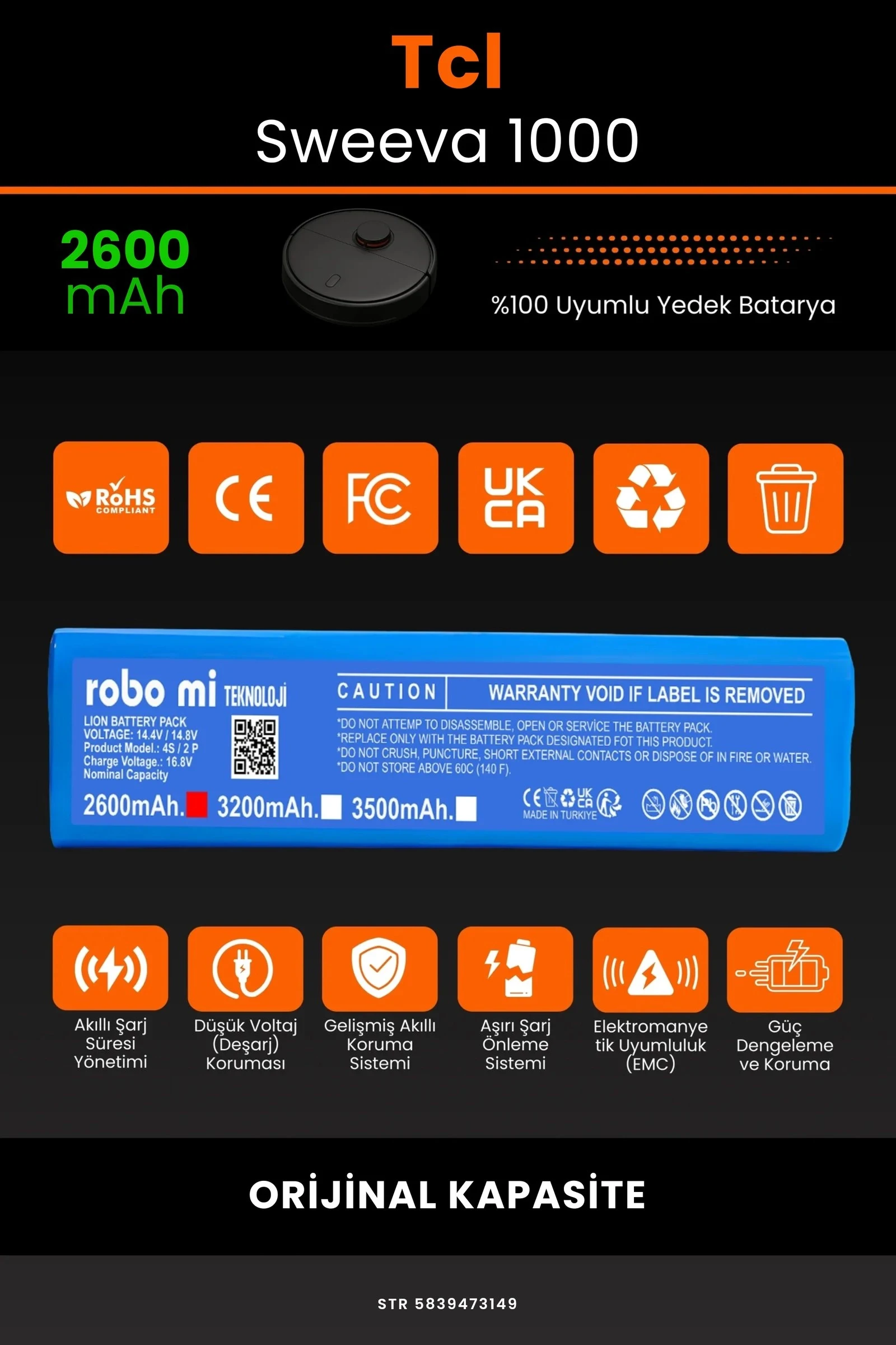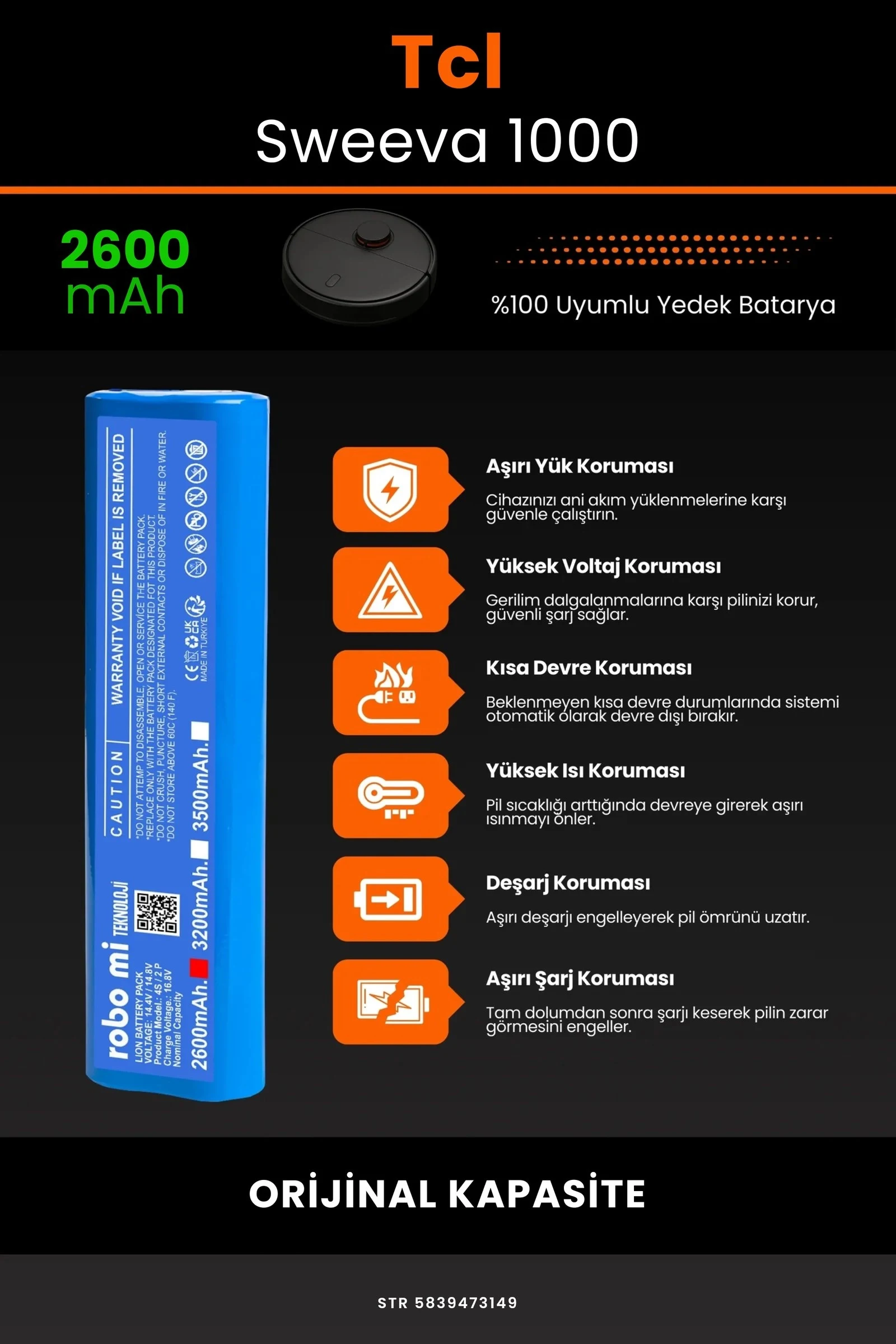 Robot süpürgenizin temizlik gücünü yeniden keşfetmeye hazır olun. Zamanla performansı azalan, şarjı çabuk tükenen robot süpürgeler için özel olarak geliştirilen 2600 batarya, Tcl Sweeva 1000 modelinizle tam uyum içinde çalışarak cihazınıza uzun ömür ve istikrarlı enerji sağlar.