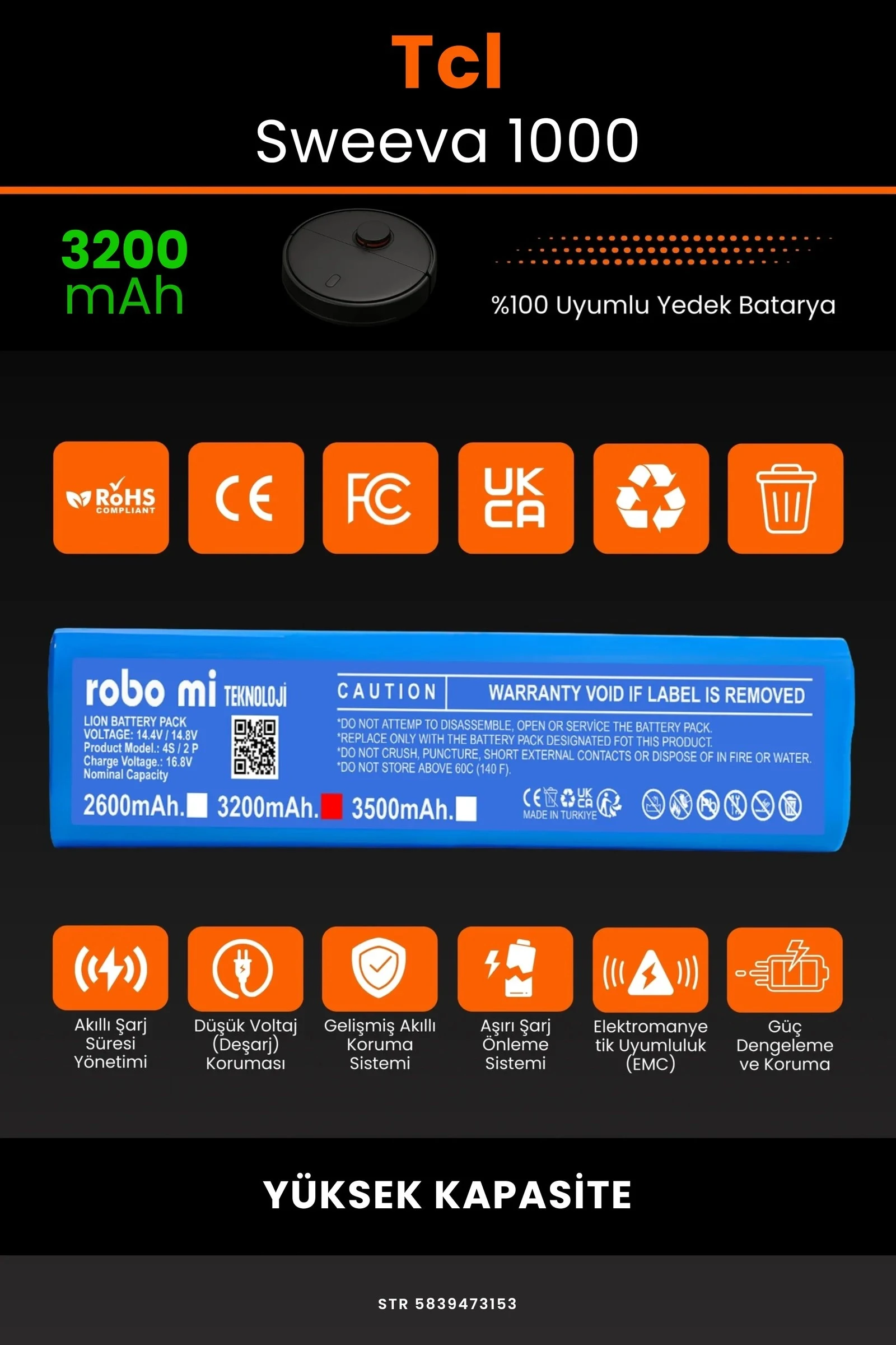 Robot süpürgenizin temizlik gücünü yeniden keşfetmeye hazır olun. Zamanla performansı azalan, şarjı çabuk tükenen robot süpürgeler için özel olarak geliştirilen 3200 batarya, Tcl Sweeva 1000 modelinizle tam uyum içinde çalışarak cihazınıza uzun ömür ve istikrarlı enerji sağlar.