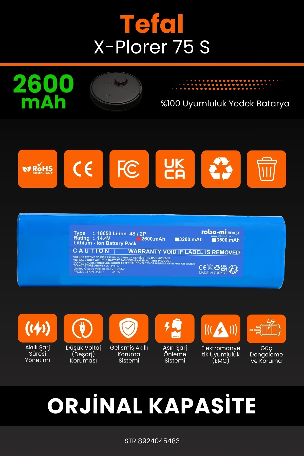 Robot süpürgenizin temizlik gücünü yeniden keşfetmeye hazır olun. Zamanla performansı azalan, şarjı çabuk tükenen robot süpürgeler için özel olarak geliştirilen 2600mAh batarya, Robo-Mi / Tefal X-Plorer 75 S modelinizle tam uyum içinde çalışarak cihazınıza uzun ömür ve istikrarlı enerji sağlar.