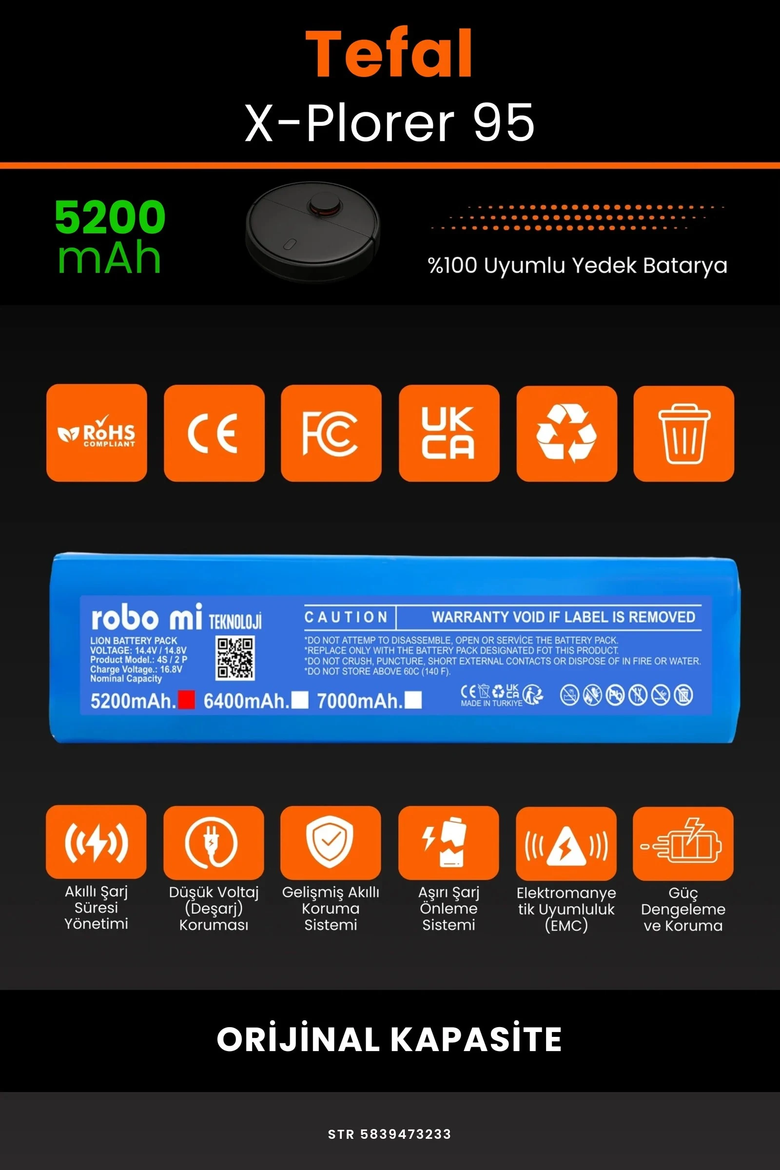Robot süpürgenizin temizlik gücünü yeniden keşfetmeye hazır olun. Zamanla performansı azalan, şarjı çabuk tükenen robot süpürgeler için özel olarak geliştirilen 5200 batarya, Tefal X-Plorer 95 modelinizle tam uyum içinde çalışarak cihazınıza uzun ömür ve istikrarlı enerji sağlar.