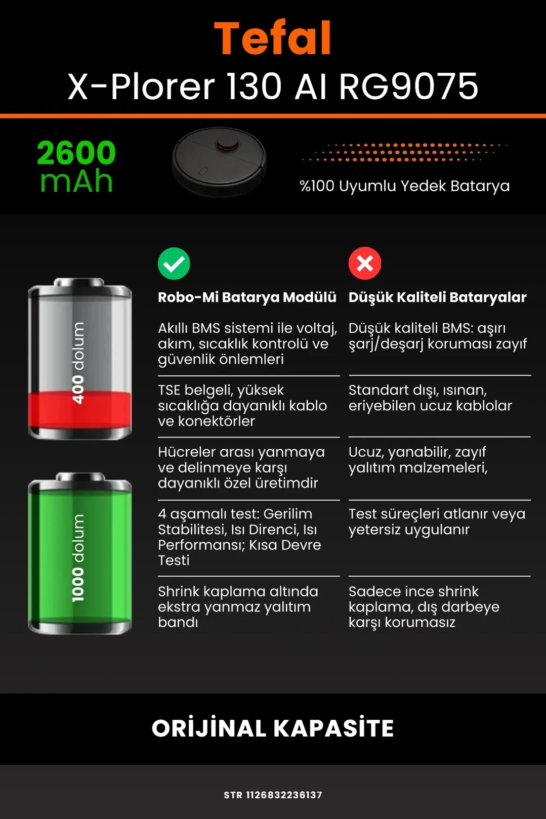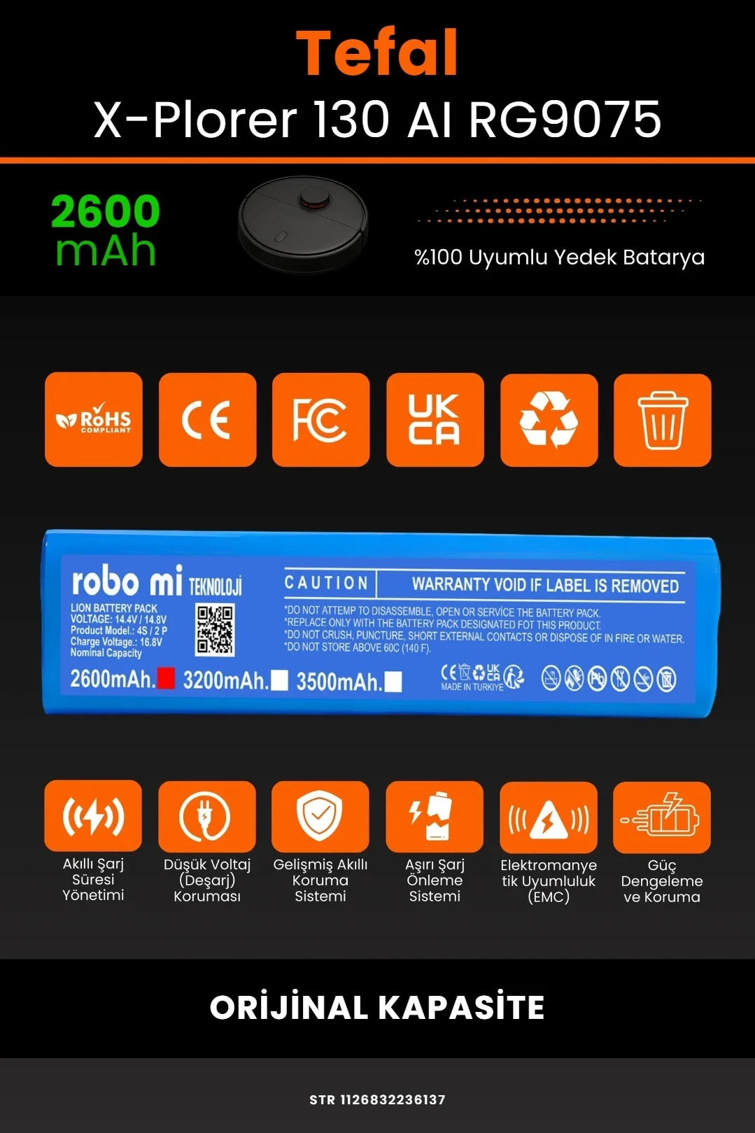 robo mi olarak tüm batarya ürünlerimizi, yüksek güvenlik standartları ve uzun ömürlü kullanım hedefiyle tasarlıyoruz. Tefal X-Plorer Serie 130 AI RG9075 modeli ile tam uyumlu olan bu robot süpürge bataryası, güçlü hücre yapısı ve akıllı devre sistemi ile cihazınızın performansını ilk günkü seviyesine yakın bir şekilde korur.