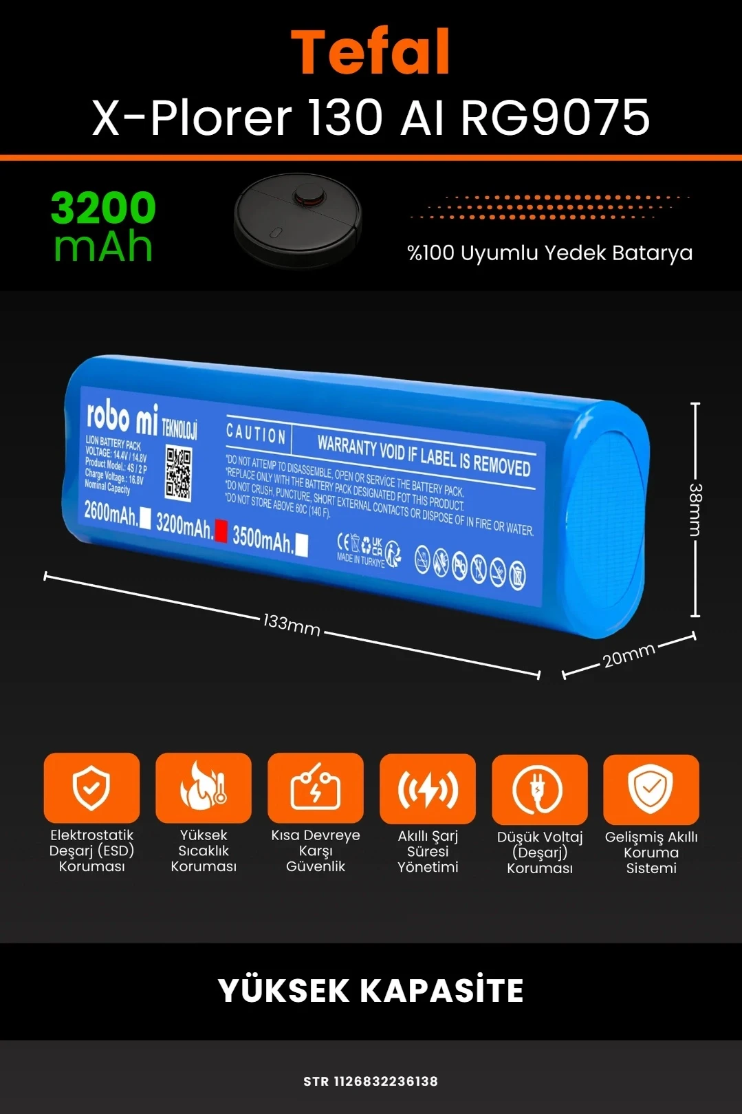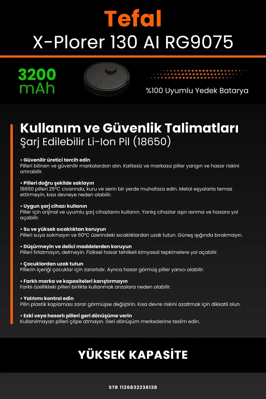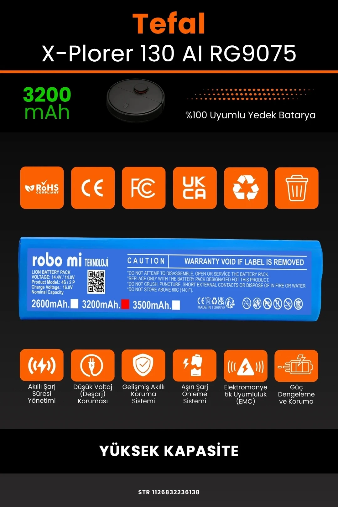 robo mi olarak tüm batarya ürünlerimizi, yüksek güvenlik standartları ve uzun ömürlü kullanım hedefiyle tasarlıyoruz. Tefal X-Plorer Serie 130 AI RG9075 modeli ile tam uyumlu olan bu robot süpürge bataryası, güçlü hücre yapısı ve akıllı devre sistemi ile cihazınızın performansını ilk günkü seviyesine yakın bir şekilde korur.