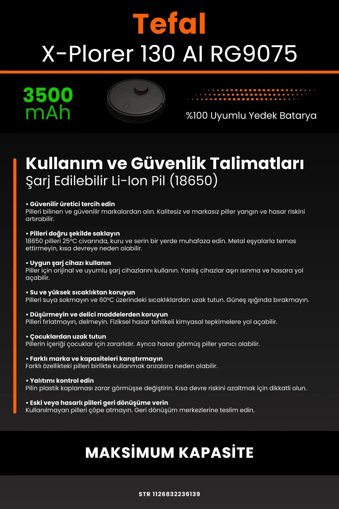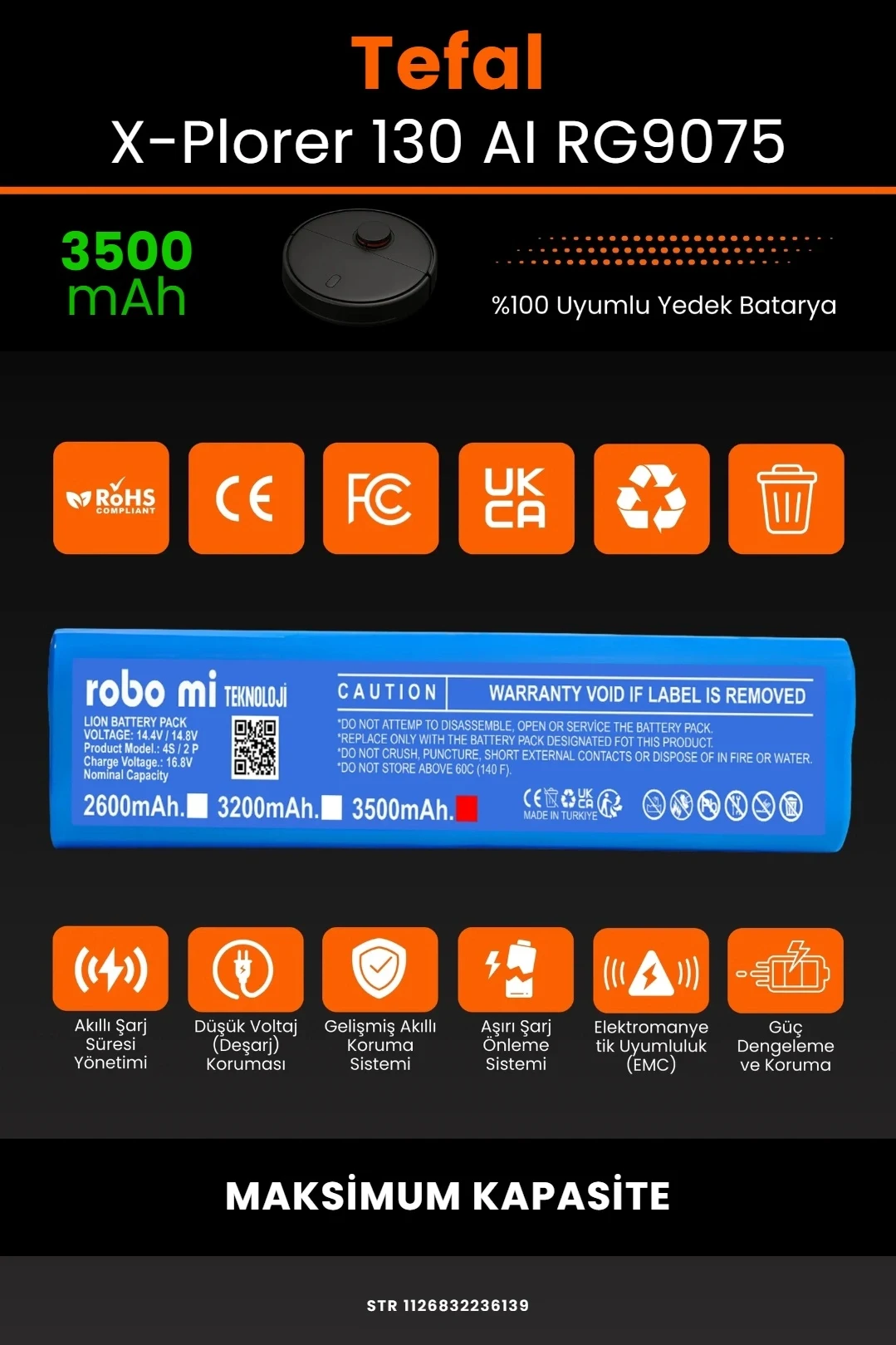 robo mi olarak tüm batarya ürünlerimizi, yüksek güvenlik standartları ve uzun ömürlü kullanım hedefiyle tasarlıyoruz. Tefal X-Plorer Serie 130 AI RG9075 modeli ile tam uyumlu olan bu robot süpürge bataryası, güçlü hücre yapısı ve akıllı devre sistemi ile cihazınızın performansını ilk günkü seviyesine yakın bir şekilde korur.