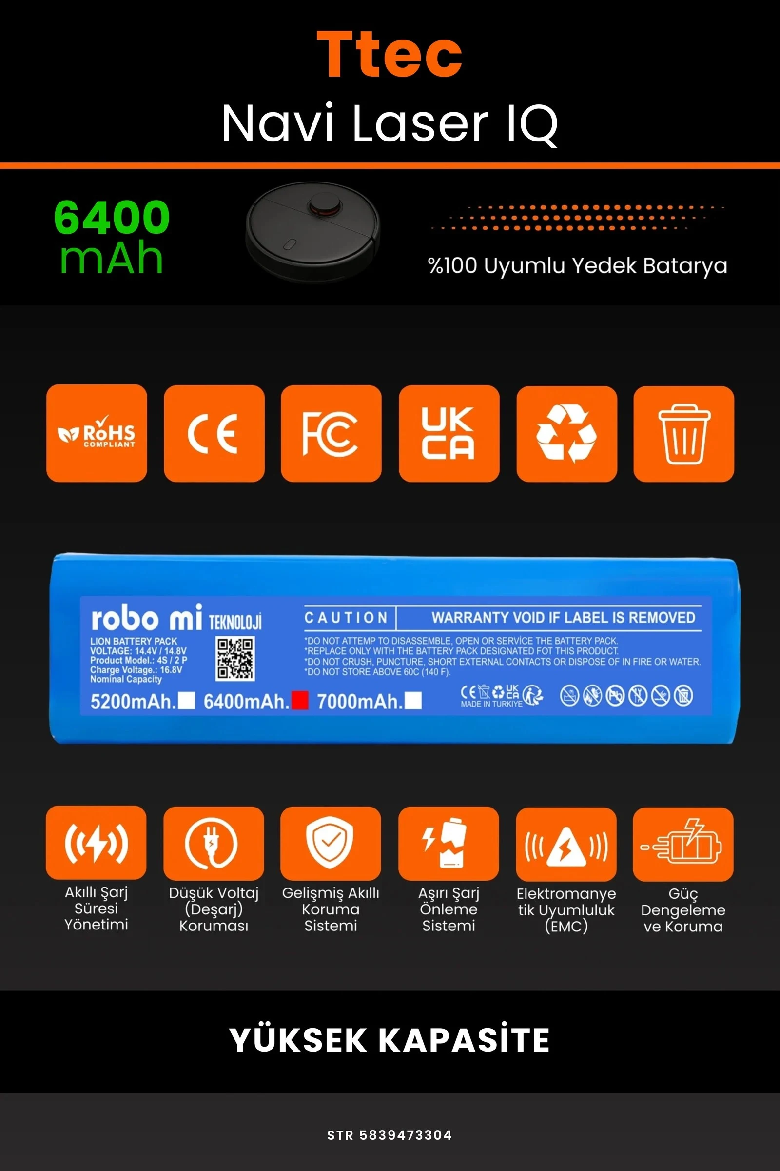 Robot süpürgenizin temizlik gücünü yeniden keşfetmeye hazır olun. Zamanla performansı azalan, şarjı çabuk tükenen robot süpürgeler için özel olarak geliştirilen 6400 batarya, TTEC Navi Laser IQ modelinizle tam uyum içinde çalışarak cihazınıza uzun ömür ve istikrarlı enerji sağlar.