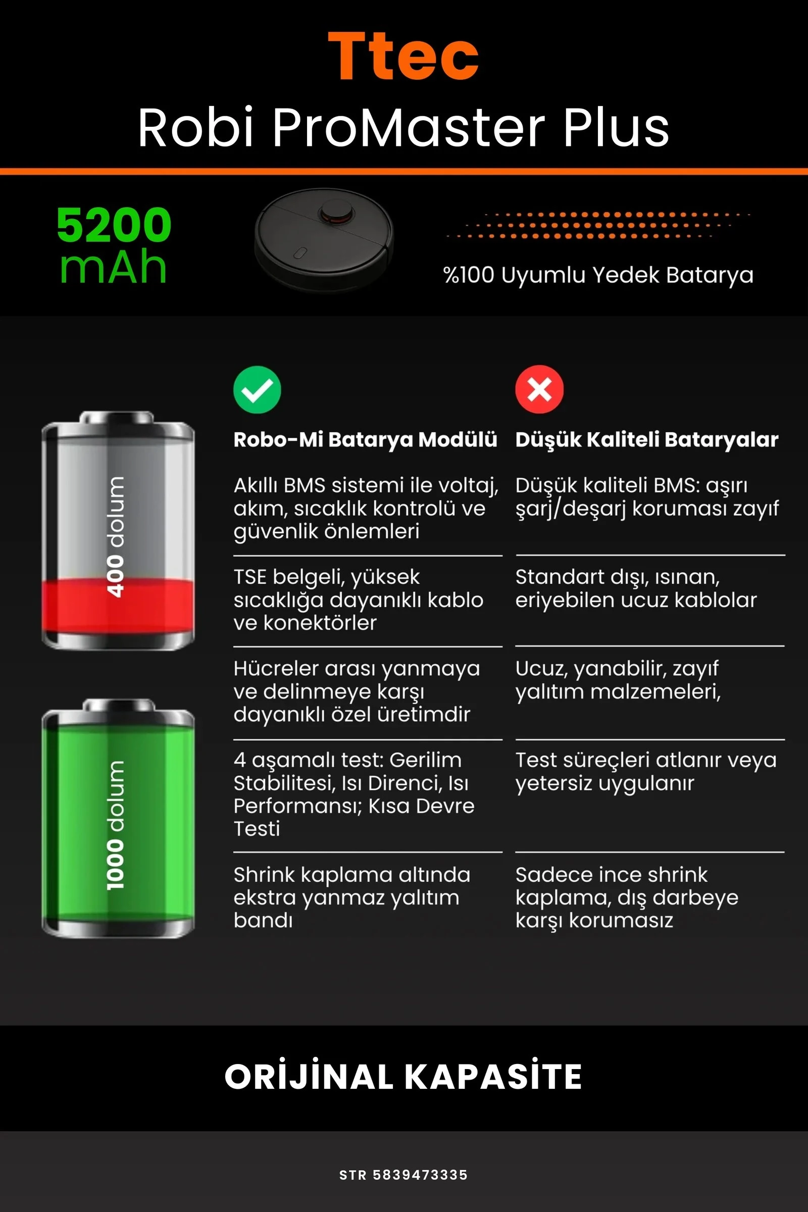 Robot süpürgenizin temizlik gücünü yeniden keşfetmeye hazır olun. Zamanla performansı azalan, şarjı çabuk tükenen robot süpürgeler için özel olarak geliştirilen 5200 batarya, TTEC Robi ProMaster Plus modelinizle tam uyum içinde çalışarak cihazınıza uzun ömür ve istikrarlı enerji sağlar.