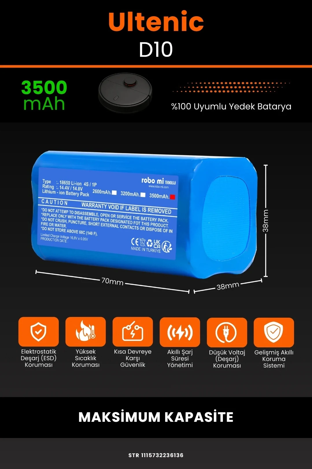 robo mi Teknoloji tarafından geliştirilen Ultenic D10 uyumlu 3500mAh lityum batarya, robot süpürgenizin fabrika çıkış performansını yeniden kazanmasını sağlar. Yüksek kaliteli hücre yapısı ve optimize edilmiş enerji yönetimi sayesinde cihazınız daha stabil, daha güvenli ve daha verimli çalışır.