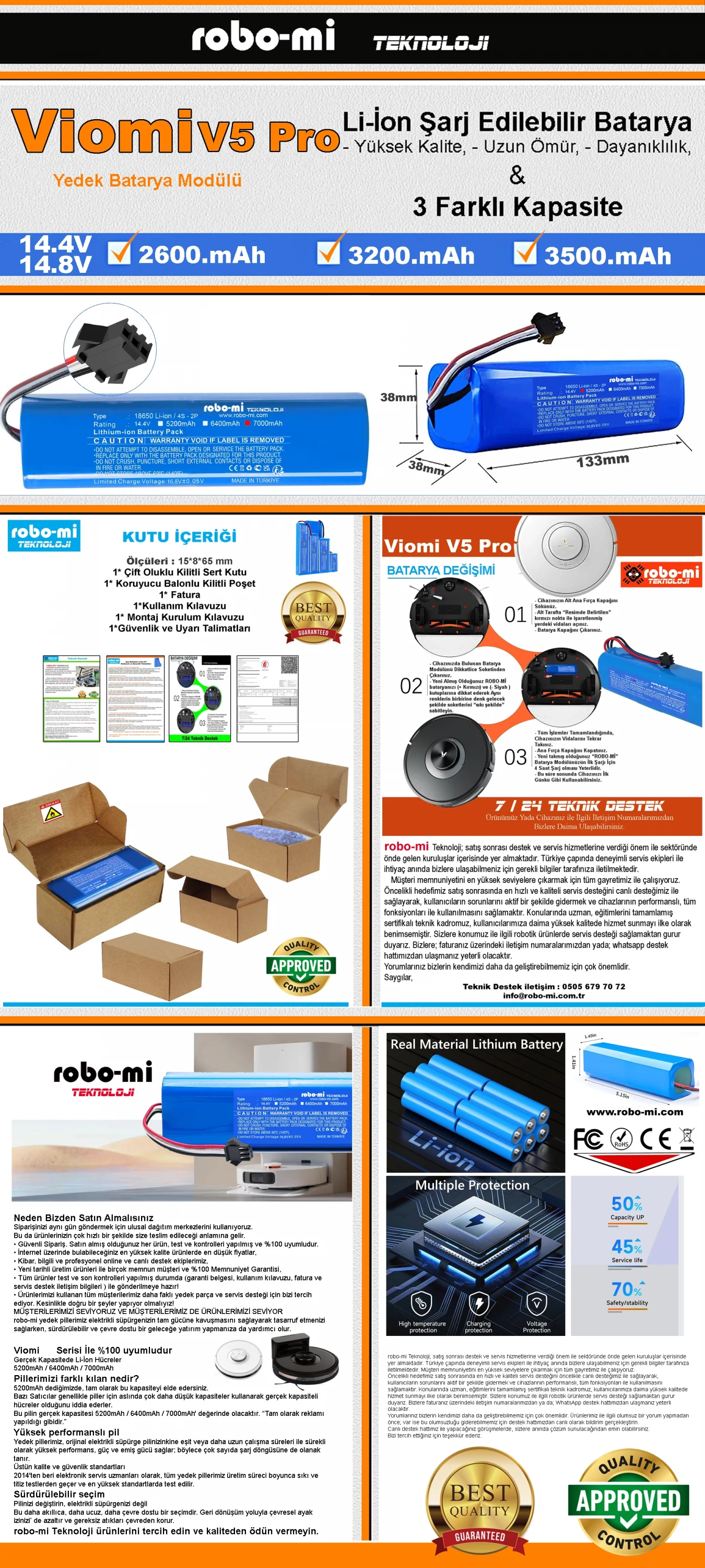 Viomi V5 robot süpürge kullanıcıları için özel olarak geliştirilen 7000mAh maksimum kapasiteli bataryalar, cihazınızın temizlik performansını üst seviyeye taşır. Standart bataryalara göre daha yüksek kapasite sunan bu ürünler, tek şarjla daha geniş alanların temizlenmesine olanak sağlar.