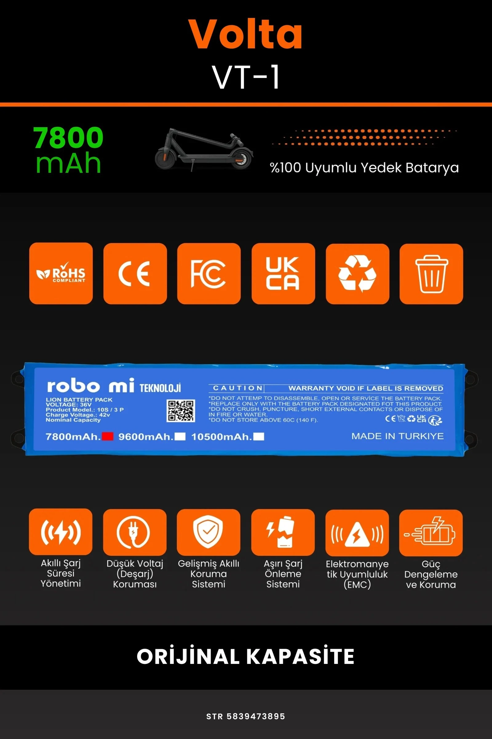 Robo-Mi Volta VT-1 /36V 7800mAh Elektrikli Scooter Bataryası - Gerçek Kapasite, Maksimum Güvenlik 7800mAh Elektrikli Scooter Bataryası