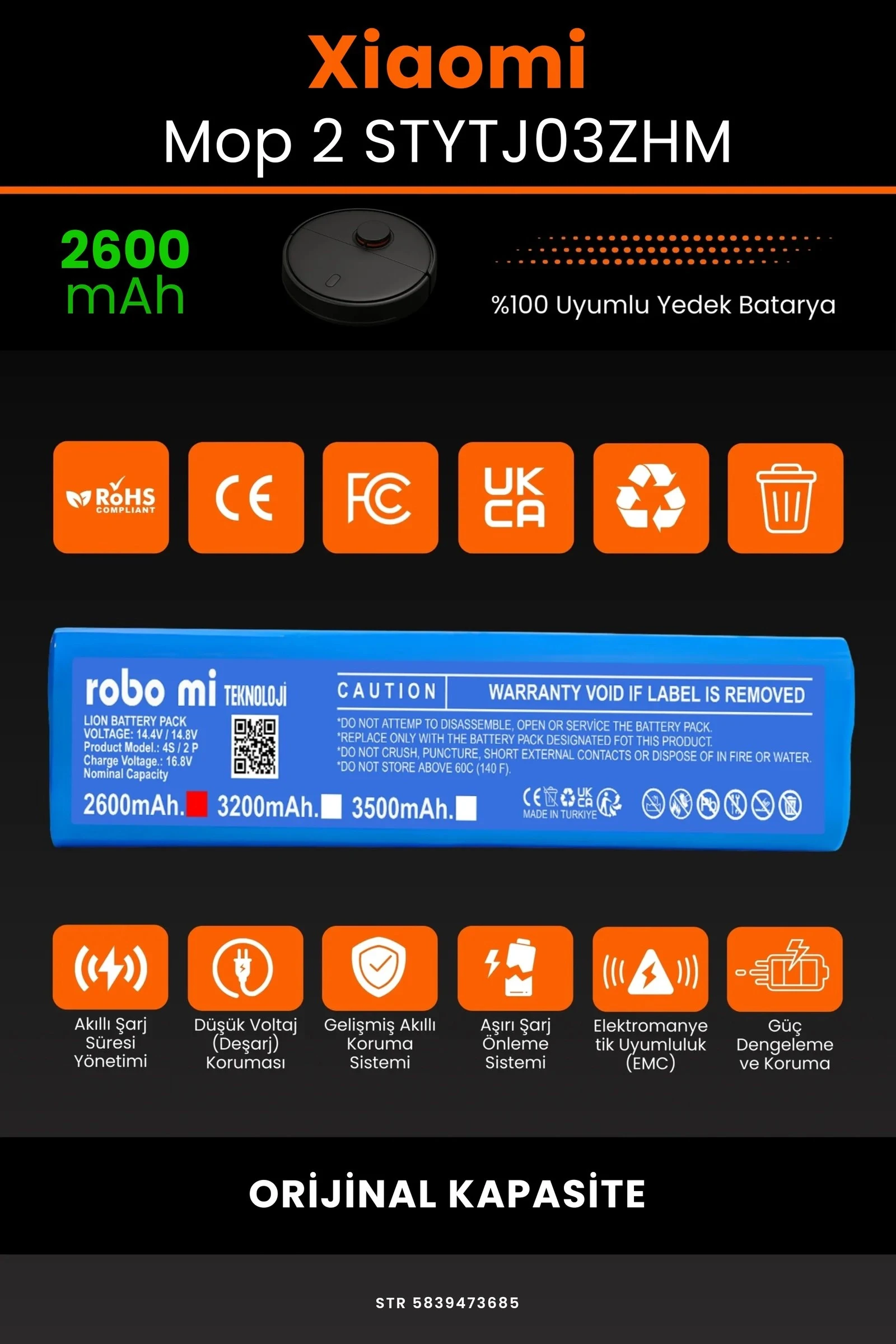 Robot süpürgenizin temizlik gücünü yeniden keşfetmeye hazır olun. Zamanla performansı azalan, şarjı çabuk tükenen robot süpürgeler için özel olarak geliştirilen 2600 batarya, Xiaomi Mi Vacuum Mop 2 STYTJ03ZHM modelinizle tam uyum içinde çalışarak cihazınıza uzun ömür ve istikrarlı enerji sağlar.
